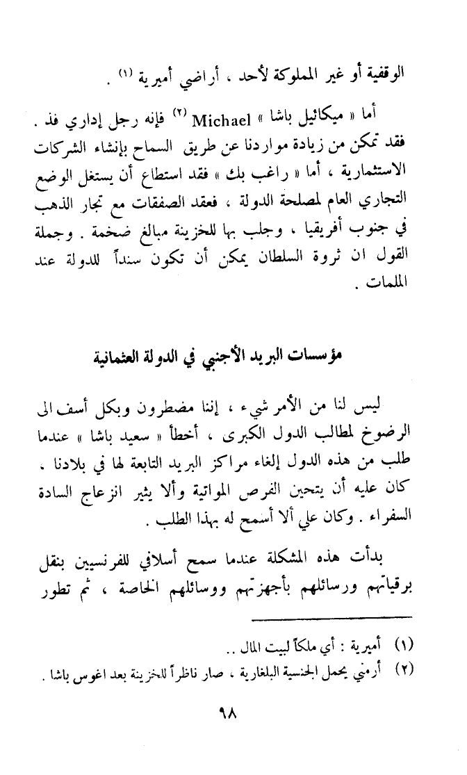 أما (مِيكَائِيل باشا (فَإِنَّهُ رجل اداري فذ فقد تمكن من زِيَادَة مواردنا عَن طَرِيق السماح بإنشاء الشركات الاستثمارية أما (رَاغِب بك (فقد اسْتَطَاعَ أَن يستغل الْوَضع التجاري الْعَام لمصْلحَة الدولة فعقد الصفقات مَعَ تجار الذَّهَب فى جنوب أفريقيا وجلب بهَا للخزينة مبالغ ضخمة وَجُمْلَة القَوْل أَن ثروة السُّلْطَان يُمكن أَن تكون سندا للدولة عِنْد الملمات