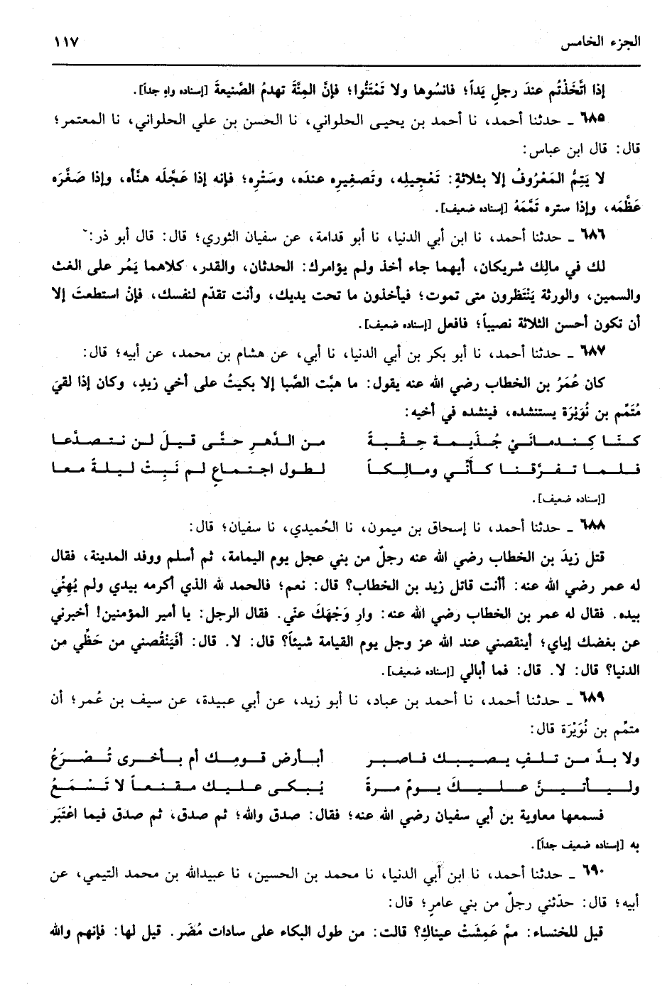 545 - حدثنا أحمد نا يوسف بن عبد الله الحلواني نا فُضيل بن عبد الوهاب نا جعفر بن سليمان عن هشام عن الحسن قال كان عمر بن الخطاب رضي الله عنه يَمُرُّ بالآية من وِرْدِهِ بالليل فيسقط حتى يُعاد منها أياماً كثيراً كما يُعاد المريض