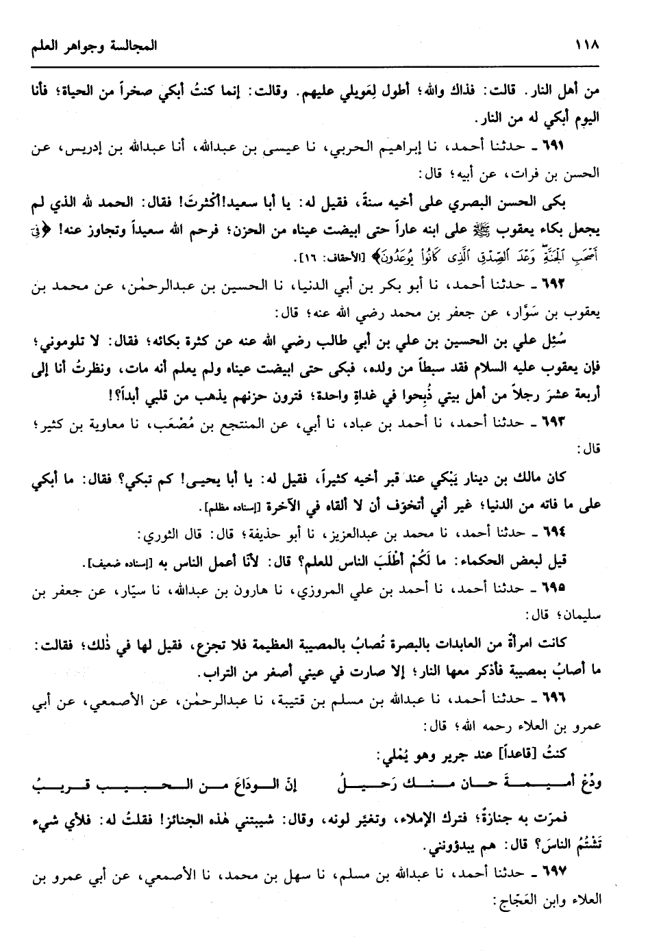 547 - حدثنا أحمد نا ابن السري البغدادي نا محمد بن مصعب قال قال ابن السماك يوم مات داود الطائي في كلامٍ له إن داود نظر بقلبه إلى ما بين يديه من آخرته فأغشى بَصَرُ القلب بَصَرَ العين فكان كأنه لا ينظر إلاّ إليه ثم قال يا داود ما أعجبَ شأنك من أهل زمانك أهنت نفسك وأنت إنما تريد إكرامها وأَتْعبتها وإنما تريد راحتها أخْشَنْتَ المطعم وإنما تريد طيبه وأَخْشَنْتَ الملبس وإنما تريد لينه ثم أمتَّ نفسك قبل أن تموت وَقَبَرْتها قبل أن تُقبر وعذبتها قبل أن تُعذب وأَتْعَبت العابد من بعدك سجنت نفسك في بيتك ولا مُحَدِّث لك ولا جليسَ معك ولا فِراش تحتك ولا ستْر على بابك ولا قُلَّة ً تُبرِّد فيها ماءك ولا صحفة ً يكون لك فيها غداؤك وعشاؤك وما اشتهيت شيئاً من الطعام والشراب ولا ليّن الثياب بل أنساك ذلك كلَّه هولُ يوم القيامة وزفير جهنّم وقيودُها وسلاسلُها وأنكالُها وأغلالُها فالحمد لله الذي لا يضيِّع سَعْيَ المطيعين ولا يَنْسى إنابتهُم وبكاءهم آناء الليل وآناء النهار