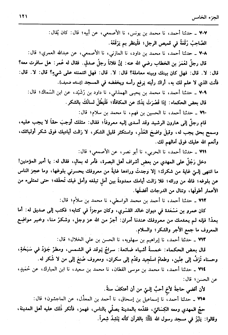 560 - حدثنا أحمد نا عبد الله بن أحمد بن خلادٍ نا عبد الرحمن بن عمرو نا شبة بن عبيدة عن أبيه عن الحسن في قول الله تبارك وتعالى ( وَلَقَّاهُمْ نَضْرَة ً وَسُرُوراً ) الإنسان 11 قال نضرة في وجوههم وسروراً في قلوبهم