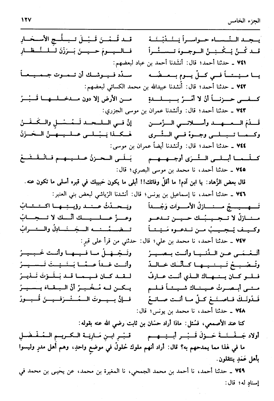 587 - حدثنا أحمد نا أحمد بن علي نا سعيد الجرمي قال سمعت مُعَلّى بن عبد الرحمن يقول وَعَظَ بعض الزهاد أصحابَه بالبصرة فقال في كلامه إن التراجع في المواعظ يوشك أن يذهب يومُها ويأتي يوم الصَّاخَّة كل الخلق يومئذ مُصيخٌ ليستمع ما يقال له ويُقضى عليه ( وَخَشَعَتِ الأَصْوَاتُ للرَّحْمَنِ فَلاَ تَسْمَعُ إلاّ هَمْساً ) طه 108 فاصمت اليوم عما يصمتك يومئذٍ وتعلم ذلك حتى تَعْلمه وابتغه حتى تجده وبادر قبل أن تفجأك دعوة الموت فإنها عنيفة إلا من رحم الله عزّ وجلّ فيقحمك في دارِ تسمعُ فيها الأصوات بالحسرة والويل والثبور ثم لا يقالون ولا يُستعتبون ولا يُرحمون ولا يجدون فيها حميماً ولا شفيعاً ولا راحة لهم فيها إلا الويلُ والعويل ( كُلَّمَا أرادُوا أنْ يَخْرُجُوا مِنْها مَنْ غَمٍّ أُعِيدُوا فيها ) الحج 22 ما لغمهم وعذابهم زمان يحصى ولا عدد يعرفونه فينتظرون الفرج وأنى لهم ذلك وهو يقول جل جلاله ( لابِثِينَ فيهَا أَحْقاباً ( 23 ) ) النبأ 23 فهذا يدل على أن كلما مضى حقبٌ جاء حقبٌ بعده أبداً فالحقب الواحد ثمانون سنة والسنة ثلاث مئة وستون يوماً اليوم منها كسائر الدنيا ثم مع هذا الذي هم فيه لا يخفف عنهم العذاب ساعة واحدة بل يزاد في كل ساعة بعذاب جديد ينسون ما كانوا فيه قبل ذلك لشدة العذاب الذي بعده أما سمعتم قوله جلّ وعز ( فَذُوقُوا فَلَنْ نَزِيدَكُمْ إلاّ عَذَاباً ( 30 ) ) النبأ 30 فهذه أشد آية نزلت في أهل النار فاعرف يا ابن آدم نفسك وسل عنها الكتاب المبين سؤال من يحبُّ أن يعلم علم من يحب أن يعرف فيعمل فاستقم كما أمرت فإنّ الربّ جلّ ثناؤه لا يعذرنا بالتعذير والتغرير ولكن يَعْذُرُ بالجَّد والتشمير اكتسِ نصيحتي فإنها كسوة ودليل على مفاتح الخير