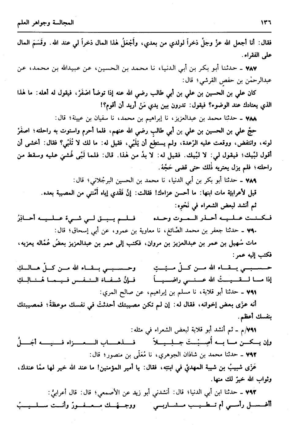 616 - حدثنا أحمد نا يوسف بن عبد الله الحلواني نا عثمان بن الهيثم عن عَوْف عن الحسن قال تكلم الحسن يوماً كلاماً فقال قد مات الأمم قبلكم وأنتم آخر الأمم فماذا تنتظرون فقد أسرع بخياركم فماذا تنتظرون آلمعاينة فكأن قد هيهات هيهات ذهبت الدنيا وبقيت الأعمال أطواقاً في أعناق بني آدم فيا لها من موعظة لو وافقت من القلوب حياة ً إنه والله لا أمة بعد أمتكم ولا نبيّ بعد نبيكم {صلى الله عليه وسلم} ولا كتاب بعد كتابكم إنكم تسوقون الناس والساعة ُ تسوقكم وإنما ينتظر أوّلكم أن يلحق بآخركم من رأى محمداً {صلى الله عليه وسلم} فقد رآه غادياً رائحاً لم يَضَعْ لبنة ً على لبنة ولا قصبة ً على قصبة رُفِعَ له عَلَمٌ فشمّرَ إليه عبادَ الله فالوحاء الوحاء النجاء النجاء علامَ تعرّجون أليس قد أُشرع بخياركم وأنتم كل يومٍ ترذلون لقد صحبتُ أقواماً كانت صحبتهم قرة َ العَيْن وجَلاء الصدور وكانوا من حسناتهم أن تُرَدّ عليهم أشفق من سيئاتكم أن تعذّبوا عليها وكانوا فيما أحلّ الله عز وجل لهم من الدنيا أزهد منكم فيما حرّم الله عليكم إني أسمع حسيساً ولا أرى أنِيْساً ذهب النَّاسُ وبقي النَّسْنَاس لو تكاشفتم لما تدافنتم تهاديتم الأطباق ولم تهادوا النصائح