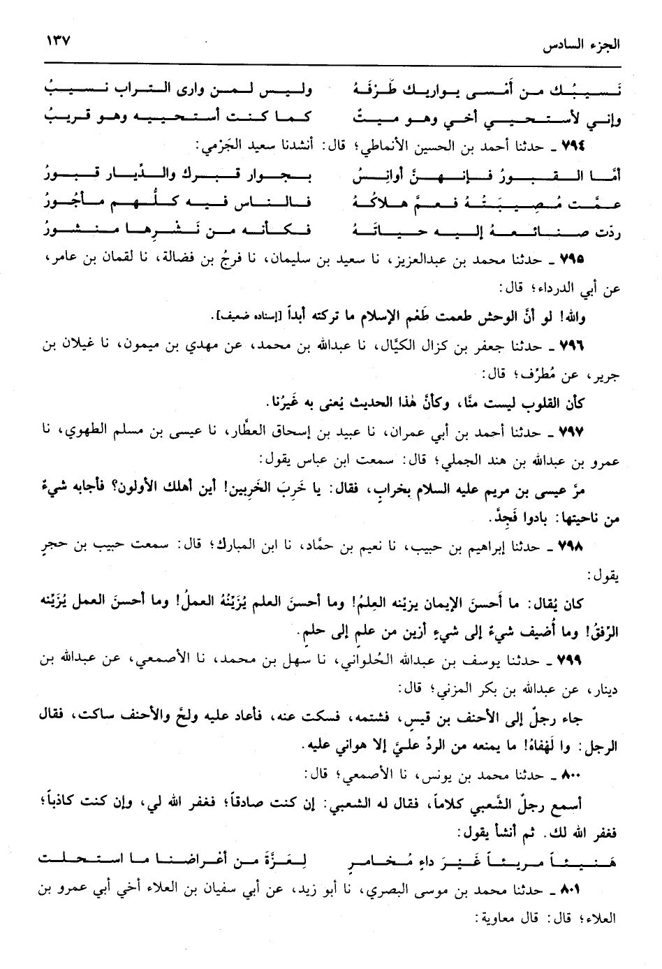 618 - حدثنا أحمد نا محمد بن يونس نا الأصمعي عن أبي عمرو بن العلاء قال كان رجلٌ من العرب في الجاهلية إذا رأى رجلاً يظلمُ قال إنَّ هذا لا يموتُ سويًّا فقيل له قد مات فُلانٌ سوياً ومات فلان سوياً فلم يقبل حتى تتابعت الأخبار فقال إن كنتم صادقين إن لكم داراً سوى ذي تجازون فيها