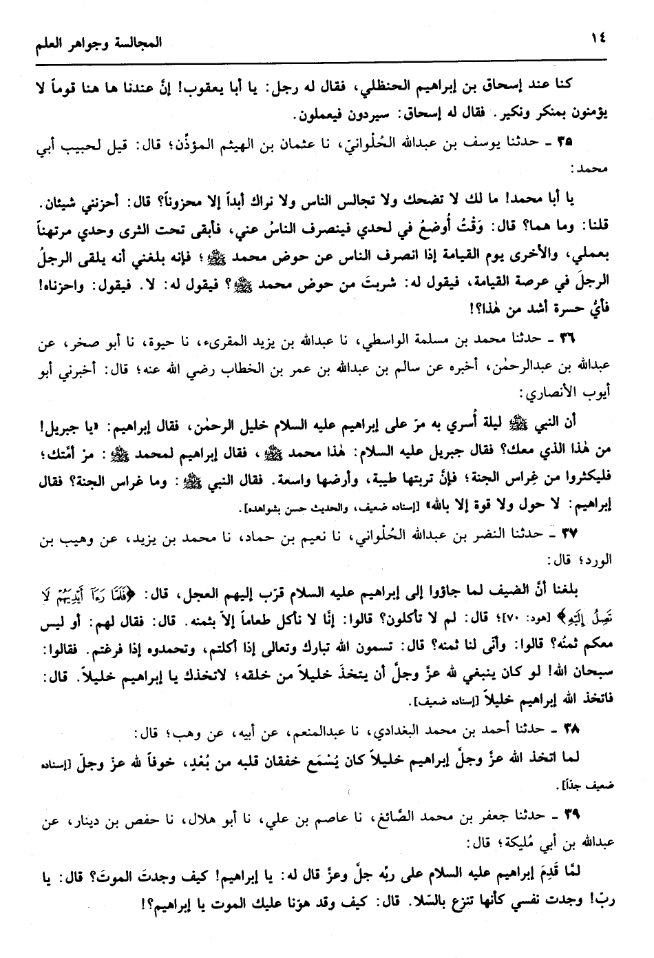 28 - حدثنا إبراهيم بن حبيب الهمذاني نا إسماعيل بن أبي أويس قال كنا عند سفيان بن عيينة في آخر عمره بمكة فحدثنا عن يحيى بن عبيد الله التيمي عن أبيه عن أبي هريرة عن النبي {صلى الله عليه وسلم} قال قال الله تبارك وتعالى للملائكة إذا هَمَّ عبدي بحسنة فاكتبوها واحدة فإن عملها فاكتبوها عشراً وإذا همَّ عبدي بسيئة فلا تكتبوها فإن عملها فاكتبوها واحدة فقام رجل عليه قلنسوة سوداء وقباء ملجم فقال يا أبا محمد الملكان يعلمان الغيب فضَجّ الناس وجعل سفيان يُسكتهم بيده فلمَّا سكتوا قال الملكان لا يعلمان الغيب ولكن إذا هَمَّ العبد بحسنة فاح منه رائحة المسك فيعلمان أنه قد همَّ بالحسنة فإذا همَّ بالسيئة فاح منه رائحة النتن فيعلمان أنه قد همَّ بالسيئة قال إسماعيل بن أبي أويس فسألت من في المجلس من هذا الذي سأل سفيان بن عيينة قالوا أبو نواس الشاعر