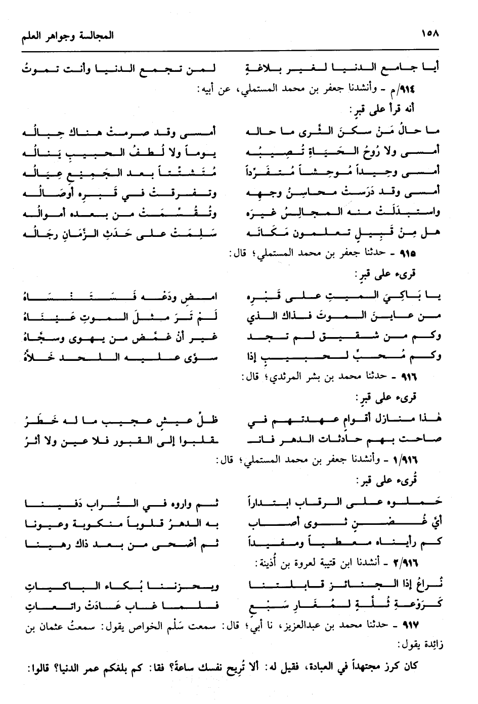 723 - حدثنا أحمد نا يحيى بن المختار قال سمعت بشر بن الحارث يقول كنت بمكة مع الفضيل بن عياض فجلس معنا إلى نصف الليل ثم قام يطوف إلى الصبح فقلت يا أبا علي ألا تنام قال ويحك وهل أحدٌ يسمع بذكر النار تطيب نفسه أن ينام