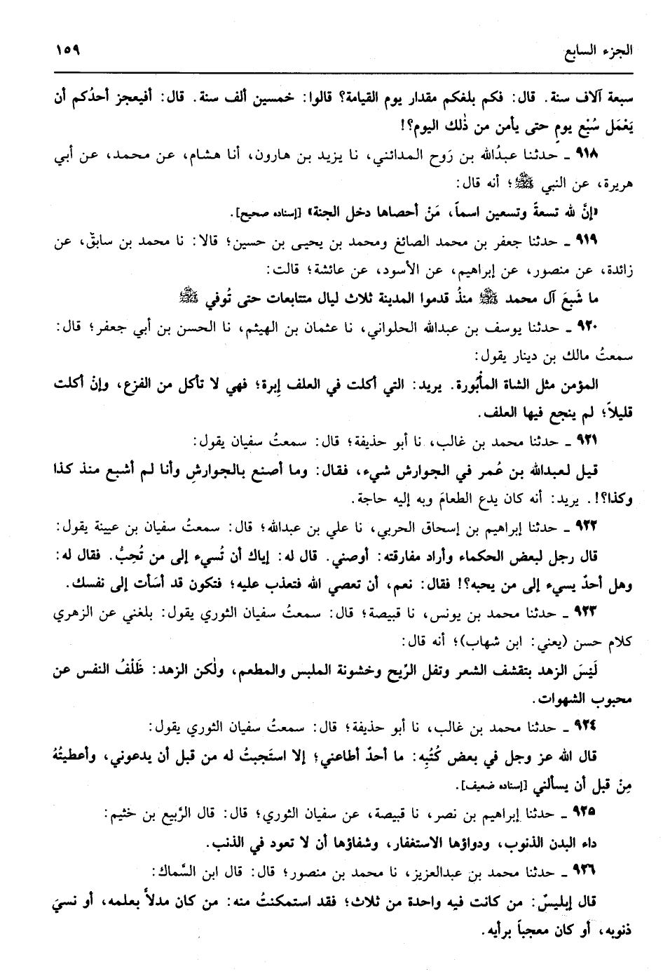 726 - حدثنا أحمد نا عمرو بن معدان التنوخي نا ابن أبي أويس عن ابن عيينة عن أبي عبد الملك قال سمعتُ عمر بن عبد العزيز عشية عرفة وهو يقول اللهم زد في إحسان محسنهم وارجع بمسيئهم إلى التوبة وحط من ورائهم بالرحمة
