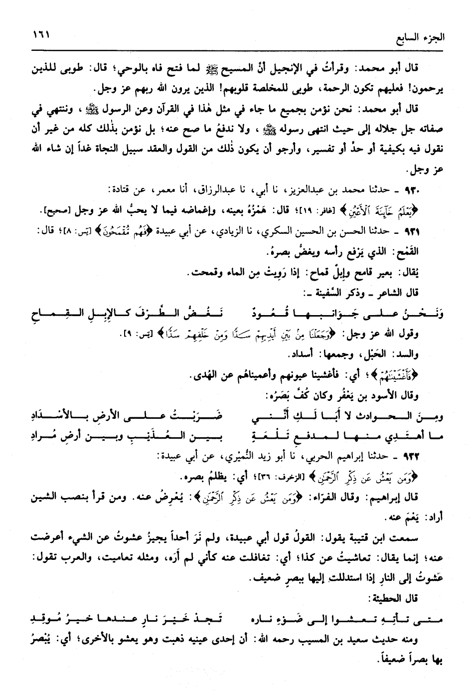732 - حدثنا أحمد نا إسحاق بن إبراهيم الخزاز نا محمد بن الحسين البرجلاني قال قيل لعفيرة العابدة ألا تسأمين من طول البكاء فبكت ثم قالت كيف يسأم ذو داء من شيء يرجو أن يكون له من دائه شفاء