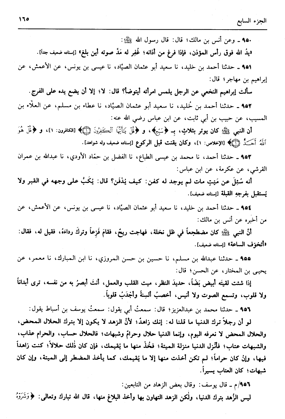 751 - حدثنا أبو إسماعيل الترمذي نا معاوية بن عمرو عن أبي إسحاق عن خالد عن أبي قلابة عن مسلم بن يسار أن رفقة من الأشعريين كانوا في سفر فلما قدموا قالوا يارسول الله ما رأينا أحدا بعد رسول الله {صلى الله عليه وسلم} أفضل من فلان يصوم النهار فإذا نزلنا قام يصلي حتى نرتحل فقال رسول الله {صلى الله عليه وسلم} من كان يمهن له أو يكفيه أو يسعى له قالوا نحن فقال رسول الله {صلى الله عليه وسلم} كلكم أفضل منه إسناده ضعيف