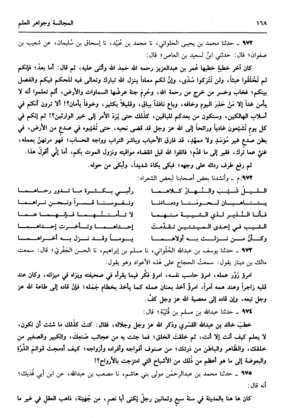 767 - حدثنا محمد بن داود الدينوري حدثنا المازني أبو عثمان نا الأصمعي قال قالت أعرابية من بنات عدي بن حاتم للمنصور في طريق مكة بعد وفاة أبي العباس أعظم الله أجرك في أخيك لا مصيبة على الأمة أعظم من مصيبتك ولا عوض لها أعظم من خلافتك