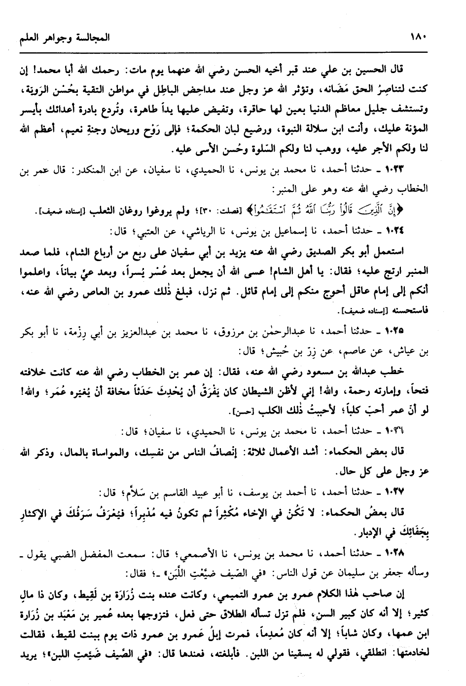 فلما قرأ معاوية الكتاب قال لعنة الله عليه ما أدري ما هذا ما له إلا ابن عباس فأرسل إلى ابن عباس فساله عن ذلك فقال أحب كلمة إلى الله لا إله إلا الله لا يقبل عملا إلا بها وهي المنجية والثانية سبحان الله وهي صلاة الخلق والثالثة الحمد لله كلمة الشكر والرابعة الله أكبر فواتح الصلوات والركوع والسجود والخامسة لا حول ولا قوة إلا بالله وأما أكرم عباد الله عليه فآدم خلقه الله بيده وعلمه الأسماء كلها وأكرم إمائه عنده مريم أحصنت فرجها والأربعة التي فيها الروح ولم ترتكضن في رحم فآدم وحواء وعصى موسى وكبش إبراهيم عليه السلام والقبر الذي سار بصاحبه فقبر يونس بن متى في بطن الحوت والمكان الذي لم تصبه الشمس إلا مرة واحدة فالبحر فلقه موسى {صلى الله عليه وسلم} بعصاه وقوس قزح أمان لأهل الأرض من الغرق والمجرة فهي باب السماء إسناده ضعيف جدا