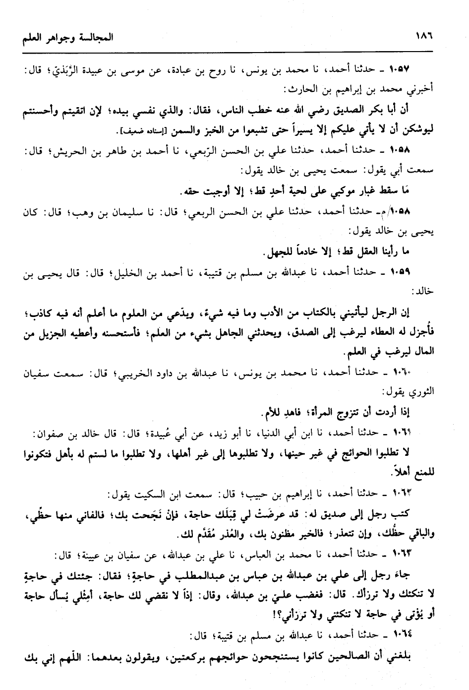 857 - حدثنا محمد بن يحيى بن عبد الرحمن الأزدي نا روح بن أسلم نا قثم العابد قال سمعت عبد الواحد بن زيد يقول هَبَطْتُ مرة ً وادياً في بعض أسفاري فإذا براهبٍ ٍ قد حبس نفسه في بعض غيرانه فراعني ذلك فقلت إنسيٌّ أو جنيّ فقال لي وفيم الخوف من غير الله أنا رجلٌ أَوْبَقَتْهُ ذنوبه فهرب إلى ربِّه ليس بِجِنّيّ ولكن إنسي مغرور قلت مُذْ كَمْ أنت ها هنا قال مُذ ثلاثين سنة قلت من أنيسُك قال الوحشُ قلت فما طعامك قال البهار - يعني نبات الأرض - قلت ما تشتاق إلى الناس قال منهم هربت قلت فعلى الإسلام أنت قال ما أعرف غيره غير أن المسيح {صلى الله عليه وسلم} أَمَرَ في بعض الكتب بالعُزْلَة والانفراد عند فساد الناس قال عبد الواحد فحسدته والله على مكانه ذلك
