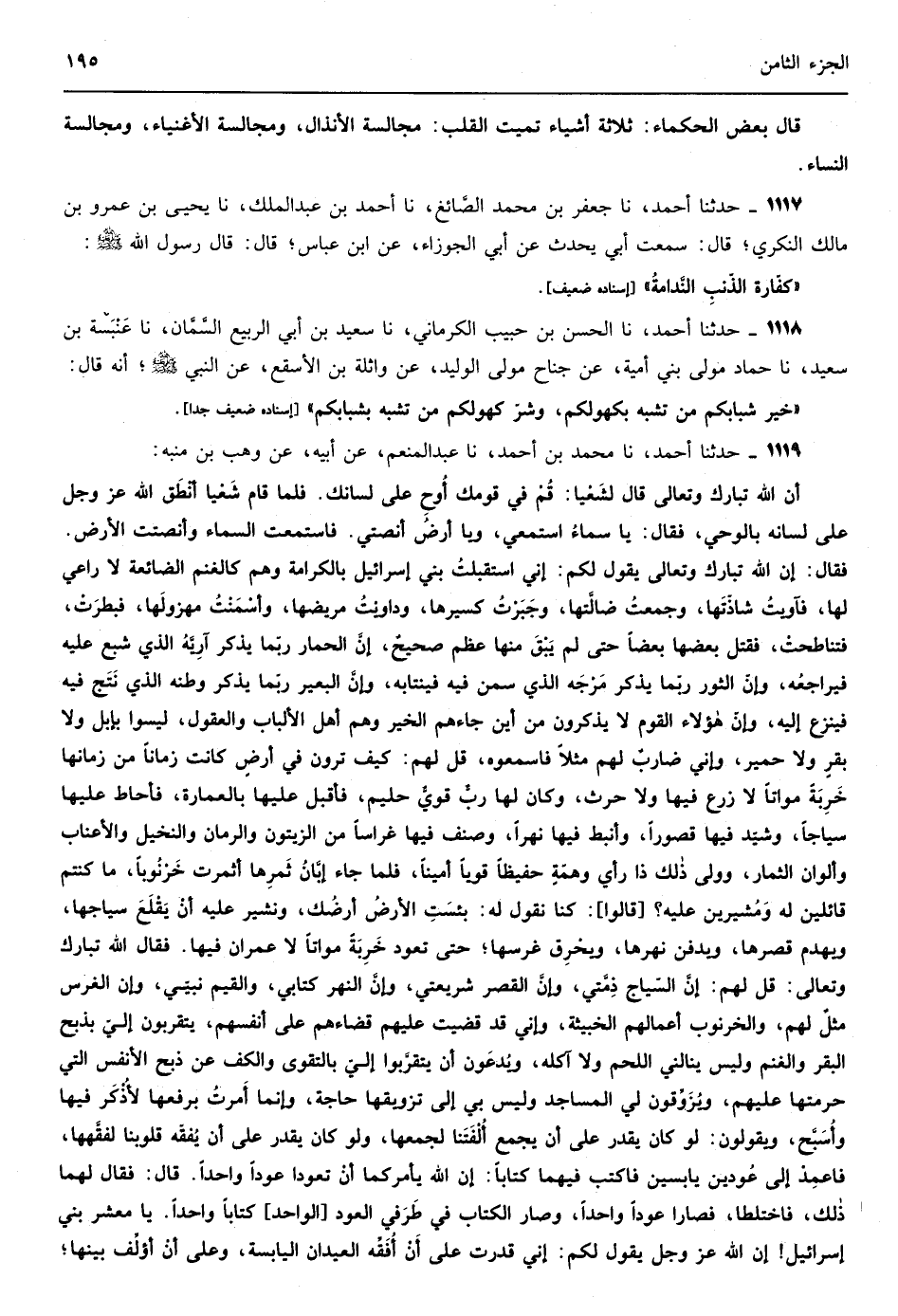 أن قم بين ظهراني قومك فأخبرهم أن لهم قلوبا ولا يفقهون وأعيناً ولا يبصرون وآذانا ولا يسمعون وأني تذكرت صلاح آبائهم فعطفني ذلك على أبنائهم فسلهم كيف وجدوا غب طاعتي أو هل سعد أحد ممن عصاني بمعصيتي وهل شقي أحد ممن أطاعني بطاعتي إن الدواب تذكر أوطانها فتنزع إليها وإن هؤلاء القوم تركوا الأمر الذي أكرمت عليه آباءهم فالتمسوا الكرامة من غير وجهها أما خيارهم فأنكروا حقي وأما قراؤهم فعبدوا غيري وأما نسّاكهم فلم ينتفعوا بما علموا وأما ولاتهم فكذبوا علي وعلى رسلي خزنوا المكر في قلوبهم وعودوا الكذب ألسنتهم وإني أقسم بجلالي وعزتي لأهيجن عليهم جنودا لا يفقهون ألسنتهم ولا يعرفون وجوههم ولا يرحمون بكاءهم ولأبعثن فيهم ملكا جبارا قاسيا له عساكر كقطع السحاب ومراكبا كأمثال العجاج كأن خفقان راياته طيران النسور وكأن حمل فرسانه كر العقبان يعيدون العمران خرابا ويتركون القرى وحشة فيا ويل إيليا وسكانها كيف أذللهم للقتل وأسلط عليهم السباء وأعيد بعد لجب الأعراس صراخا وبعد صهيل الخيل عواء الذئاب وبعد شرفات القصور مساكن السباع وبد ضوء السرج وهج العجاج وبالعز الذل وبالنعمة العبودية ولأبدلن نساءهم بعد الطيب التراب وبالمشي على الزرابي الخبب ولأجعلن أجسادهم ذبلا للأرض وعظامهم ضاحية للشمس ولأدوسنهم بألوان العذاب ثم لآمرن السماء فلتكونن طبقا من حديد والأرض سبيكة من نحاس فإن أمطرت لم تنبت الأرض وإن أنبتت شيئا في خلال ذلك فبرحمتي للبهائم ثم أحبسه في زمان الزرع وأرسله في زمان الحصاد فإن زرعوا في خلال ذلك شيئا سلطت عليه الآفة فإن خلص منه شيء نزعت منه البركة فإن دعوني لم أجبهم وإن سألوني لم أعطهم وإن بكوا لم أرحمهم وإن تضرعوا صرفت وجهي عنهم إسناده واه جداً