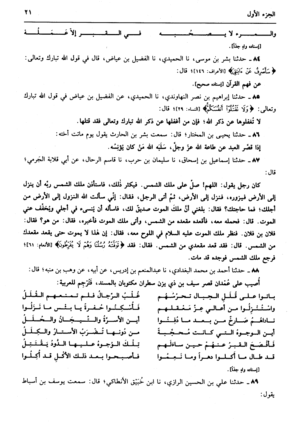 69 - حدثنا أحمد بن الحسين المروزي نا عبد الله بن سعيد نا يحيى بن اليمان قال سمعت الثوري يقول إنما مثلُ الدُّنيا مثلُ رغيفٍ عليه عسلٌ مرّ به ذبابٌ فقطع جناحه ومثل رغيف يابس مرّ به فَسَلِمَ
