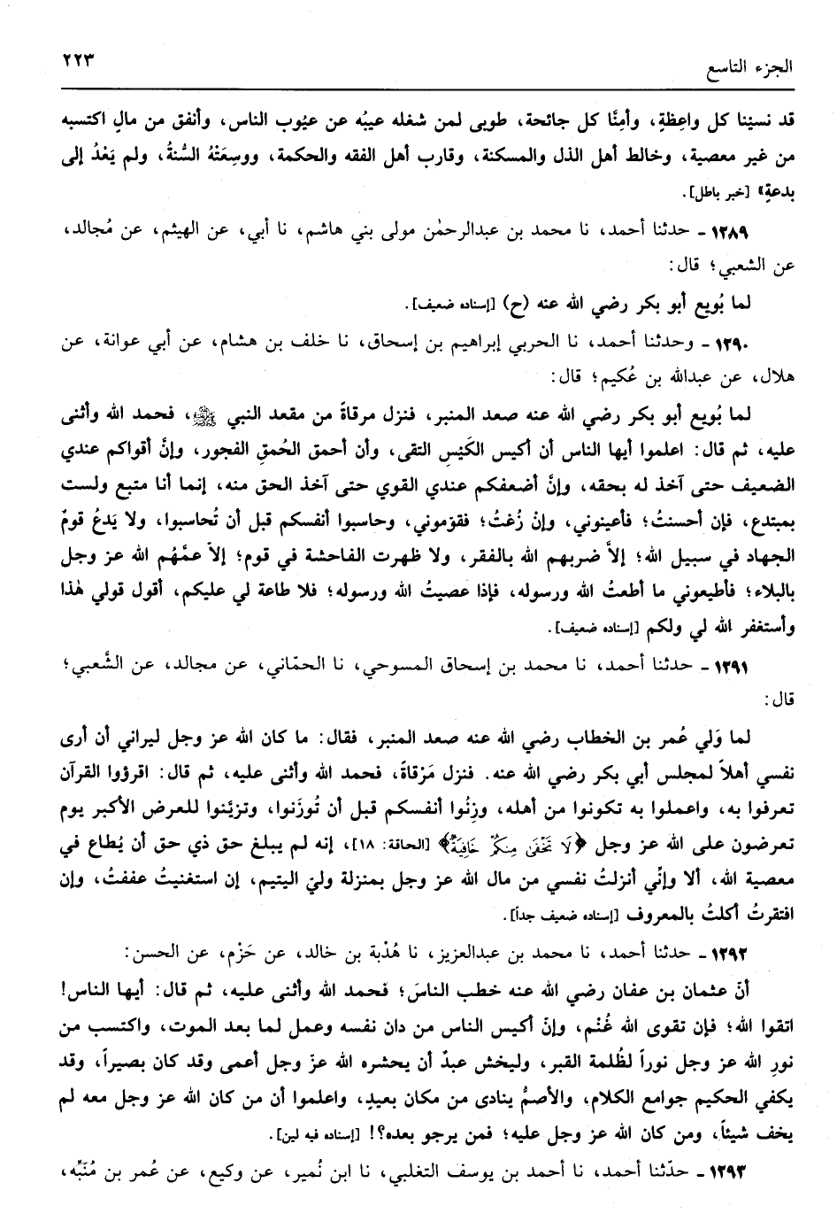 1017 - حدثنا علي بن الحسن الربعي نا ابن أبي الحواري قال سمعت أبا سليمان يقول بينما عيسى صلوات الله عليه يمشي في يوم صائف وقد مسه حر الشمس والعطش فجلس في ظل خيمة فخرج إليه صاحب الخيمة فقال يا عبد الله قم من ظلنا فقام عيسى فجلس في الشمس وقال ليس أنت الذي أقمتني أنما أقامني الذي لم يرد أن أصيب من الدنيا شيئاً آخر الجزء السابع يتلوه الثامن إن شاء الله تعالى والحمد لله وحده وصلواته على سيدنا محمد وآله وصحبه وسلم