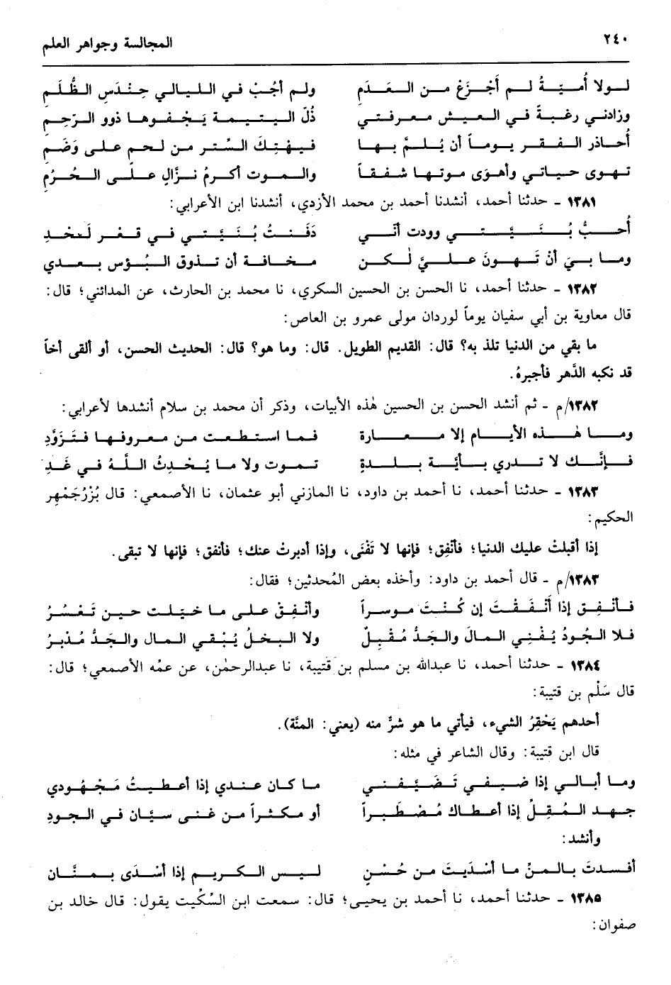 1081 - حدثنا أحمد نا زكريا بن يحيى الناقد نا فضيل بن عبد الوهاب قال سمعت يحيى بن يمان يقول كان سفيان الثوري رحمه الله إذا جلسنا معه كأنه على مقلاة من خوف الله تبارك وتعالى فإنما نسمعه يذكر الموت الموت النار النار فقيل له يوماً في ذلك فقال بلغني عن ابن عباس رضي الله عنه أنه قال في قول الله عز وجل ( يَوْمَ يَجْمَعُ اللهُ الرُّسُلَ فَيَقُولُ مَاذآ أُجِبْتُمْ قَالُوا لاَ عِلْمَ لَنَآ إنَّكَ عَلَّمُ الغُيُوبِ ( 109 ) ) المائدة 109 فتدخلهم دهشة من أهوال يوم القيامة لأن الموت والبعث والقيامة لها زلازل شداد وأهوال لا يسلم نبي ولا ولي من تلك الشدة ومنها كان النبي {صلى الله عليه وسلم} يتعوذ بالله من عذاب القبر وكان خائفاً وجلاً مغموماً محزوناً في الدنيا ومن ذلك أن الأنبياء صلى الله عليهم أجمعين يوم القيامة يقولون يا رب نفسي نفسي ويقول نبينا {صلى الله عليه وسلم} أمّتي أمّتي والله تبارك وتعالى يقول ( وَإِن مِنكُم إلَّا وَارِدُهَا كَانَ عَلَى رَبِّكَ حَتْماً مَّقْضِياً ( 71 ) ) مريم 71 وعمر رضي الله عنه يقول عند موته لو كان لي طلاع الأرض ذهباً لافتديت به من هول المطلع وأبو بكر الصديق رضي الله عنه يجبذ لسانه ويبكي ويقول هذا الذي أوردني الموارد فإذا كان الأنبياء صلوات الله عليهم والصحابة رضي الله عنهم خائفين من هول ذلك اليوم فكيف بنا الذي قد أتعبنا الحفظة من كثرة ذنوبنا إسناده ضعيف جداً
