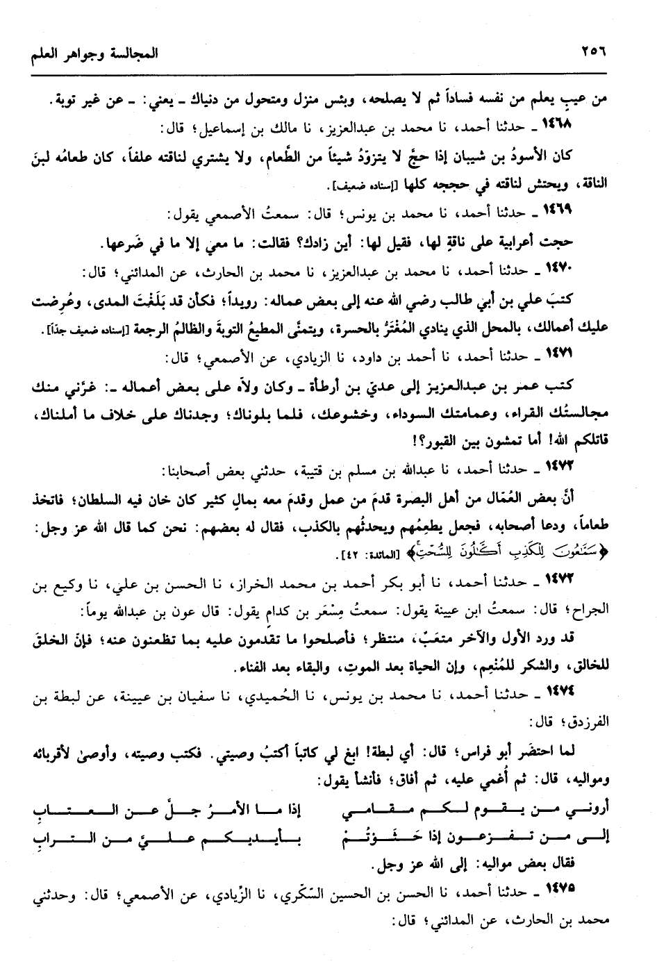 من كتاب المجالسة وجواهر العلم صلى الله على سيدنا محمد وعلى آله وصحبه وسلم أخبرنا الشيخان أبو القاسم هبة الله بن علي بن سعود البوصيري وأبو عبد الله محمد بن حمد بن حامد الأرتاحي إذناً قالا أنا الشيخ أبو الحسن علي بن الحسين بن عمر الفراء الموصلي قال البوصيري قراءة ً عليه وأنا أسمع وقال ابن حمد إجازة قال أنا أبو القاسم عبد العزيز بن الحسن بن إسماعيل الضراب أنا أبي أبو محمد الحسن بن إسماعيل بن الضراب قراءة ً عليه نا أحمد بن مروان الدينوري
