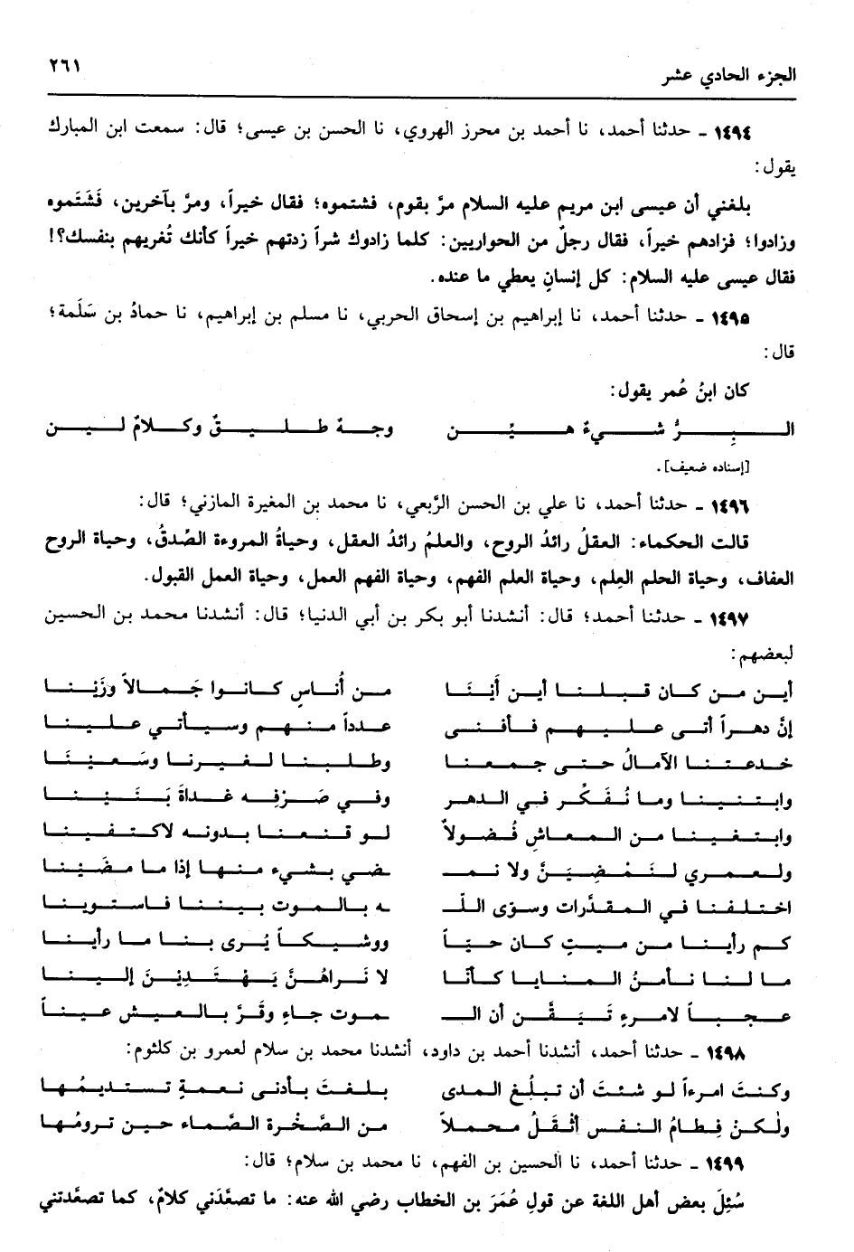 1196 - حدثنا أحمد نا إبراهيم الحربي نا سعيد بن سليمان نا سليمان بن المغيرة عن ثابت قال قال عيسى ابن مريم عليه السلام طوبى لمن علمه الله كتابه ثم لم يمت جبارا رجاله ثقات