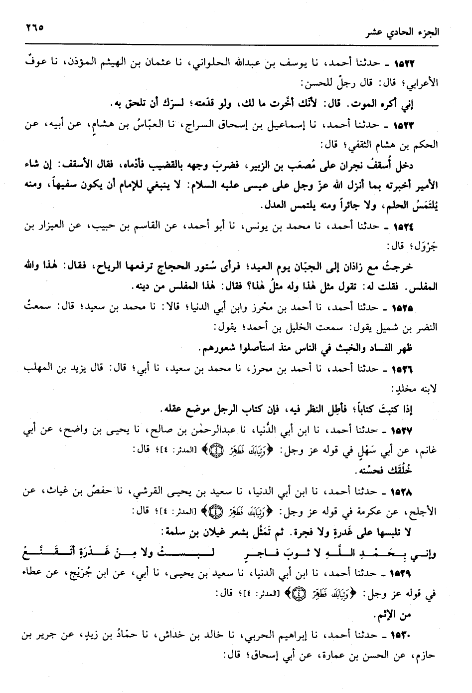 1213 - حدثنا أحمد نا زيد بن إسماعيل نا أحمد بن عمران عن سفيان الثوري قال لما جاء البشير إلى يعقوب {صلى الله عليه وسلم} قال على أي حال تركت يوسف قال على الإسلام قال الآن تمت النعمة