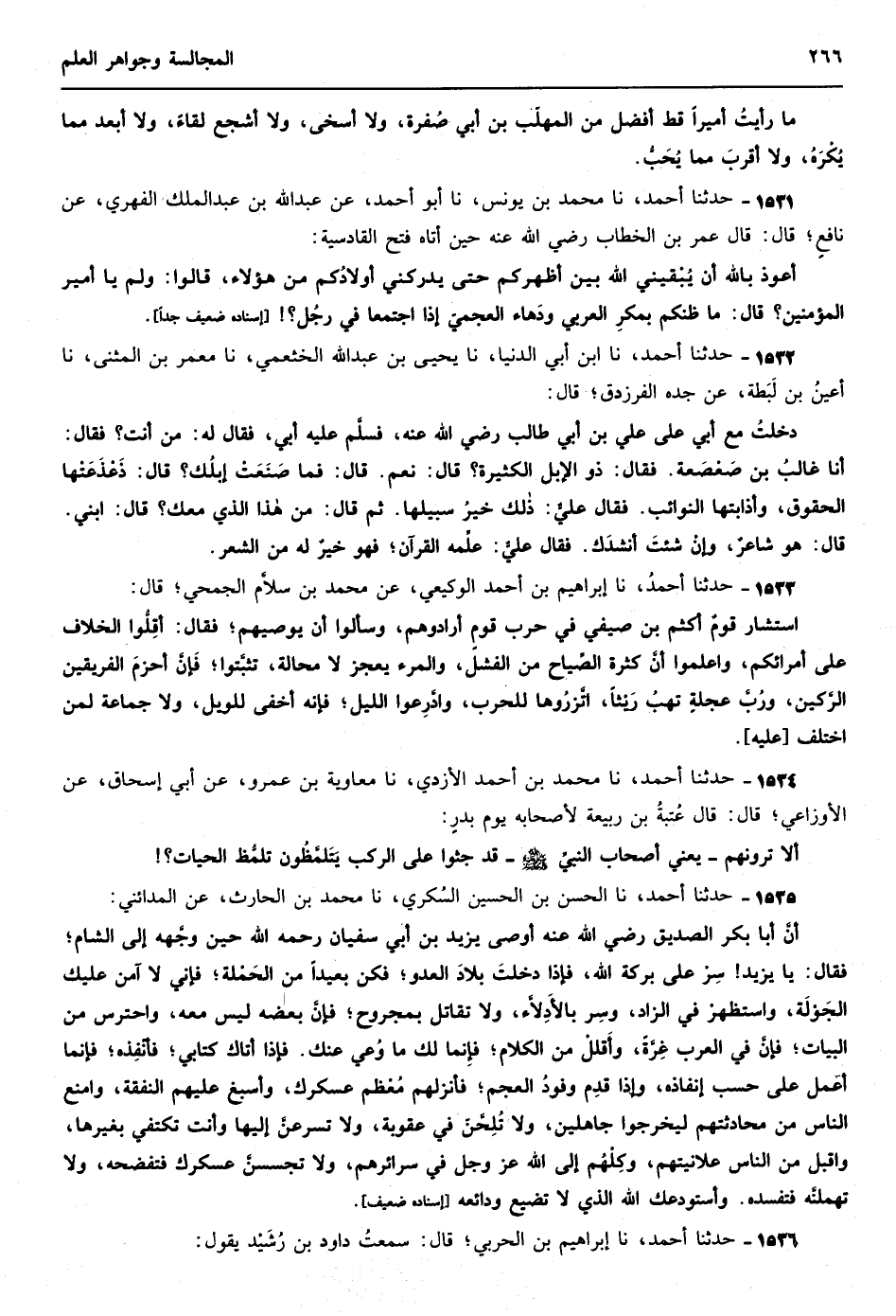 1220 - حدثنا أحمد نا أحمد بن محمد الأزدي نا معاوية بن عمرو القصّار عن أبي إسحاق عن إسماعيل بن أبي خالد عن عاصم قال كان عمر بن الخطاب رضي الله عنه إذا بعث عاملا اشترط عليه أربعاً أن لا يركب البراذين ولا يلبس الرقيق ولا يأكل النّقي ولا يتَّخذ بواباً ولا حاجباً قال ومر ببناء يبنى بحجارة وجص فقال لمن هذا فذكروا أنه لعامل من عماله على البحرين فقال أبت الدراهم إلا أن تخرج أعناقها وقاسمه ماله وكان يقول لي على كل خائن أمينان الماء والطين إسناده ضعيف