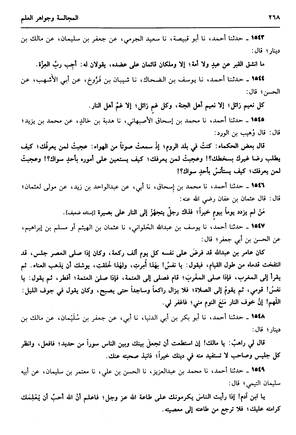 1229 - حدثنا أحمد نا أحمد بن محمد الرزاز عن حميد بن مسعدة عن جعفر بن سليمان عن هشام عن الحسن قال مات أخ لنا فلما وضع في قبره ومد عليه الثوب جاء صلة بن أشيم فأخذ بجانبي الثوب ثم نادى يا فلان