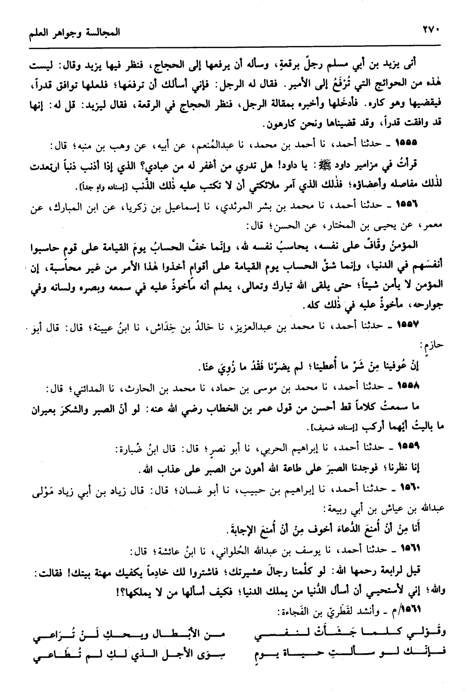 1237 - حدثنا أحمد نا الحارث بن أبي أسامة نا داود بن المحبر عن المبارك بن فضالة عن ثابت البناني قال بينا أنا واقف بجبل عرفات في ناحية من الناس إذ أقبل شابان عليهما العباء القطواني فقال أحدهما لصاحبه يا حبيب فأجابه الآخر لبيك أيها المحب قال أترى الذي تحاببنا وتواددنا من أجله يعذبنا غدا في القيامة قال فسمع صوتا من الهواء يقول كلا ليس بفاعل