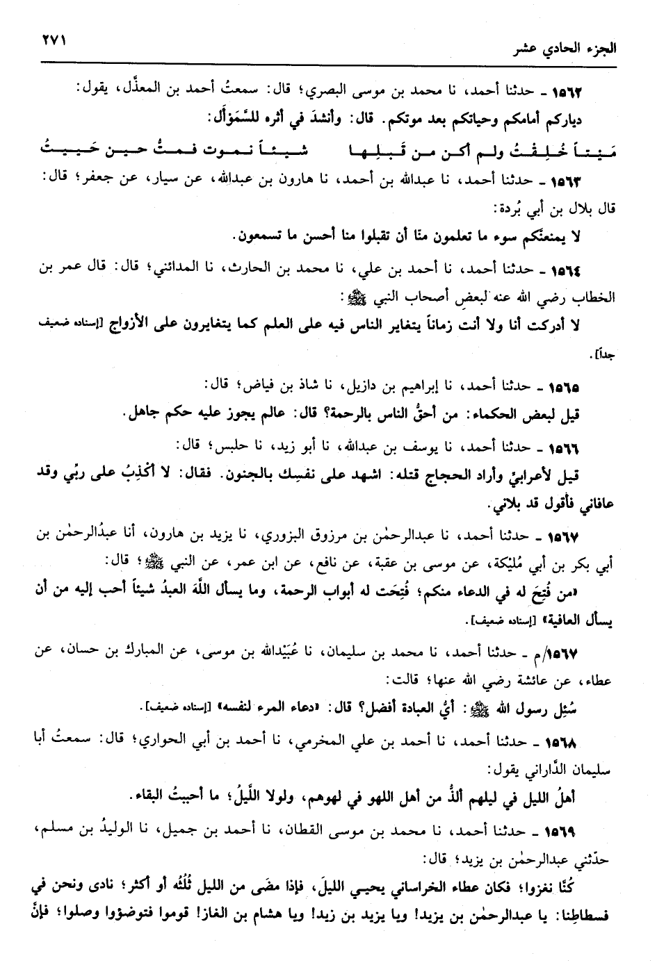 1246 - حدثنا أحمد نا إبراهيم بن دازيل الهمذاني نا إبراهيم بن حمزة نا حاتم بن إسماعيل عن يحيى بن عبد الرحمن بن أبي لبيبة عن جده قال قال رسول الله {صلى الله عليه وسلم} والذي نفسي بيده إنه لمكتوب عند الله عز وجل حمزة بن عبد المطلب أسد الله وأسد رسوله {صلى الله عليه وسلم} إسناده ضعيف جداً