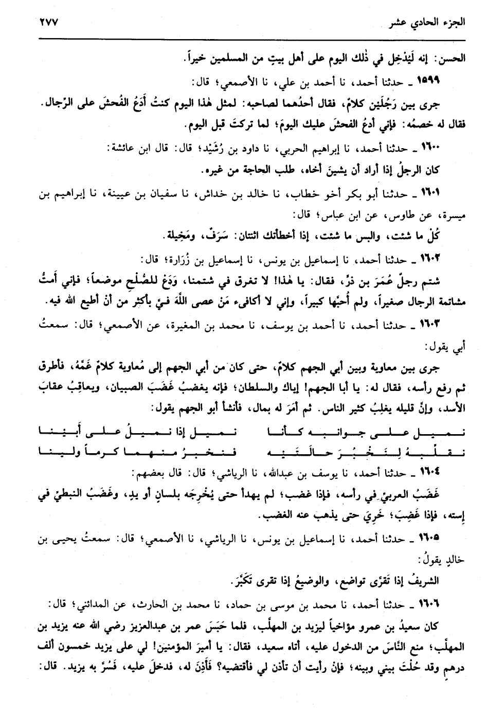 1267 - حدثنا أحمد نا أحمد بن علي الوراق نا إبراهيم بن بشار نا نعيم بن مورع نا هشام بن حسان قال بينا نحن عند الحسن إذ أقبل رجل من الأزارقة فقال له يا أبا سعيد ما تقول في علي بن أبي طالب قال فاحمرت وجنتا الحسن وقال رحم الله عليا إن علياً كان سهما لله صائبا في أعدائه وكان في محلة العلم أشرفها وأقربها من رسول الله {صلى الله عليه وسلم} وكان رهباني هذه الأمة لم يكن لمال الله بالسروقة ولا في أمر الله بالنؤمة أعطى القرآن عزيمة علمه فكان منه في رياض مؤنقة وأعلام بينة ذاك علي بن أبي طالب يا لكع