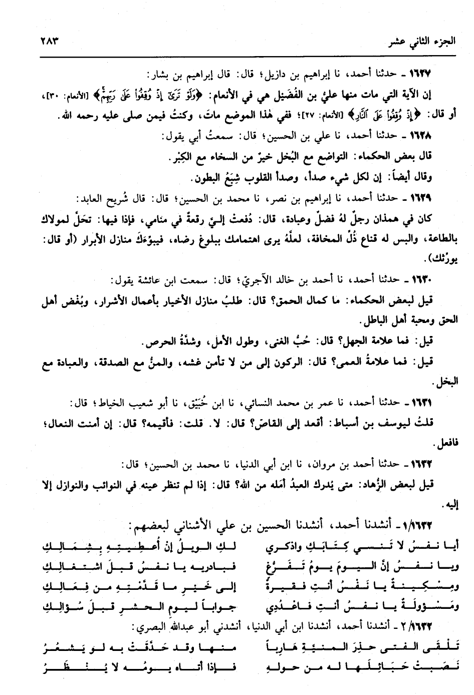 عن أوفى بن دلهم عن علي بن أبي طالب رضي الله عنه أنه خطب الناس فحمد الله وأثنى عليه ثم قال أما بعد فإن الدنيا قد أدبرت وآذنت بوداع وإن الآخرة قد أقبلت وأشرفت باطلاع وإن المضمار اليوم وغدا السباق ألا وإنكم في أيام أمل من ورائه أجل فمن قصر في أيام أمله قبل حضور أجله فقد خيب عمله ألا فاعملوا لله في الرغبة كما تعملون له في الرهبة ألا وإني لم أر كالجنة نام طالبها ولم أر كالنار نام هاربها ألا وإنه من لم ينفعه الحق ضره الباطل ومن لم يستقم به الهدى جار به الضلال ألا وإنكم قد أمرتم بالظعن ودللتم على الزاد ألا أيها الناس إنما الدنيا عرض حاضر يأكل منها البر والفاجر ألا وإن الآخرة وعد صادق يحكم فيها ملك قادر ألا إن ( الشَّيْطَنُ يَعِدُكُمُ الفَقْرَ وَيَأْمُرُكُم بِالفَحْشَاءِ واللهُ يَعِدُكُم مَغْفِرَة ً مِنْهُ وَفَضلاً واللهُ وَسِعٌ عِلِيمٌ ( 268 ) ) البقرة 268 أيها الناس أحسنوا في عمركم تحفظوا في عقبكم فإن الله تبارك وتعالى وعد جنته من أطاعه وأوعد ناره من عصاه إنها نار لا يهدأ زفيرها ولا يفك أسيرها ولا يجبر كسيرها حرها شديد وقعرها بعيد وماؤها صديد وإن أخوف ما أخاف عليكم اتباع الهوى وطول الأمل إسناده ضعيف
