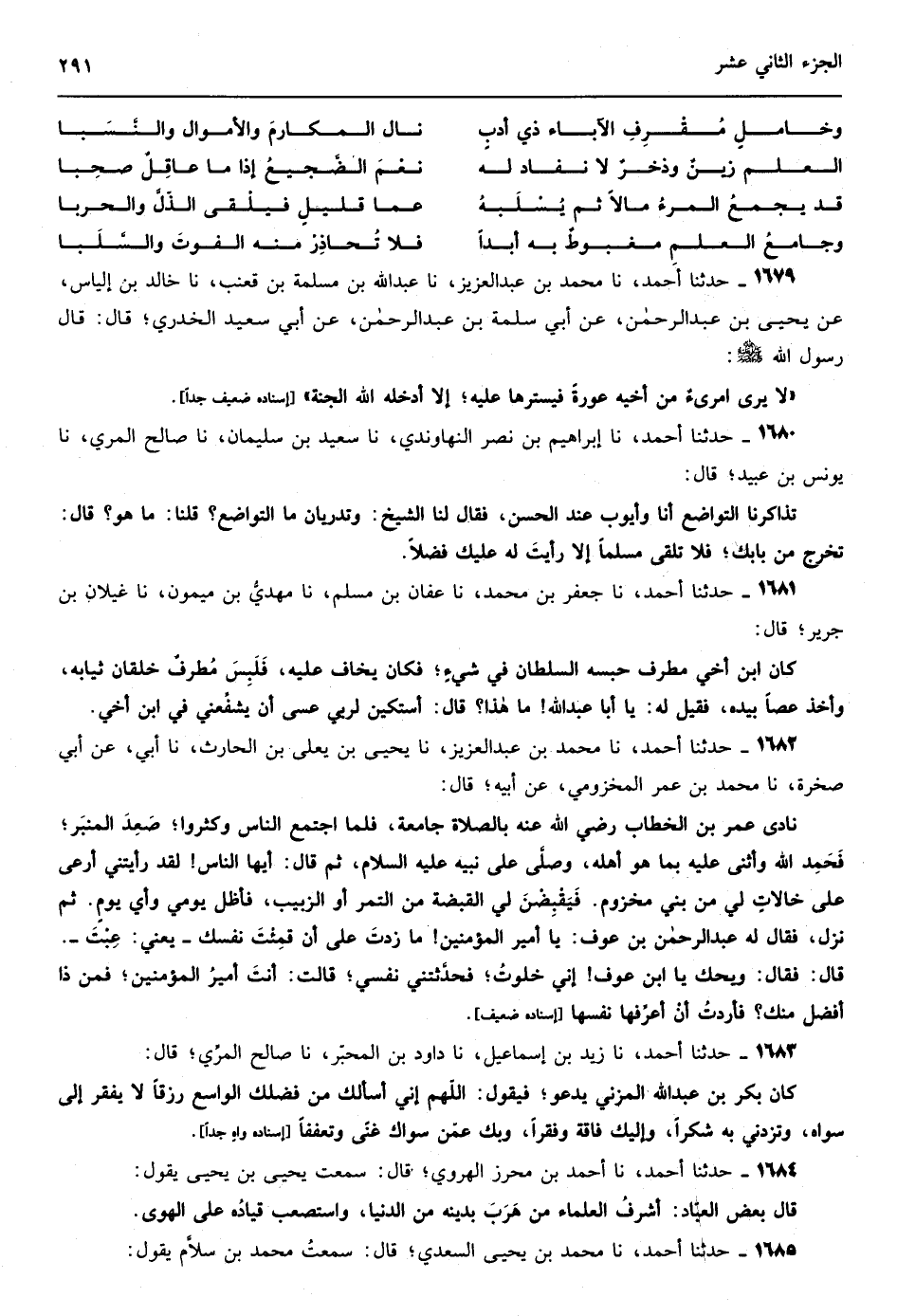 من كتاب المجالسة وجواهر العلم صلى الله على سيدنا محمد وآله وصحبه وسلم أخبرنا الشيخ أبو عبد الله محمد بن حمد بن حامد الأرتاحي إذنا قال أنا الشيخ أبو الحسن علي بن الحسين بن عمر الفراء إجازة قا أنا أبو القاسم عبد العزيز بن الحسن بن إسماعيل الضراب أنا أبي أبو محمد الحسن بن إسماعيل بن محمد الضراب حدثنا أبو بكر أحمد بن مروان بن محمد الدينوري المالكي