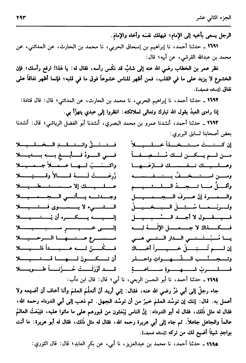 1342 - حدثنا أحمد نا محمد بن عبد العزيز نا أبي نا أبو المغيرة نا عمر نا عامر بن جشيب الأحموسي قال إن العبد ليعمل العمل سرا ما يطلع عليه أحد إلا الله تبارك وتعالى فيطلبه إبليس سنة فإن أدركه وإلا تركه ثم يقول له بعد سنة حدث بعملك فإنه قد رفع إلى الله عز وجل فإن حدث به محي عنه أجر السر ثم يطلبه سنة فيقول له حدث به فإنه قد رفع إلى الله عز وجل وليس بناقصك شيئا فإن حدث به محي عنه أجر العلانية وكتب رياءً إسناده ضعيف