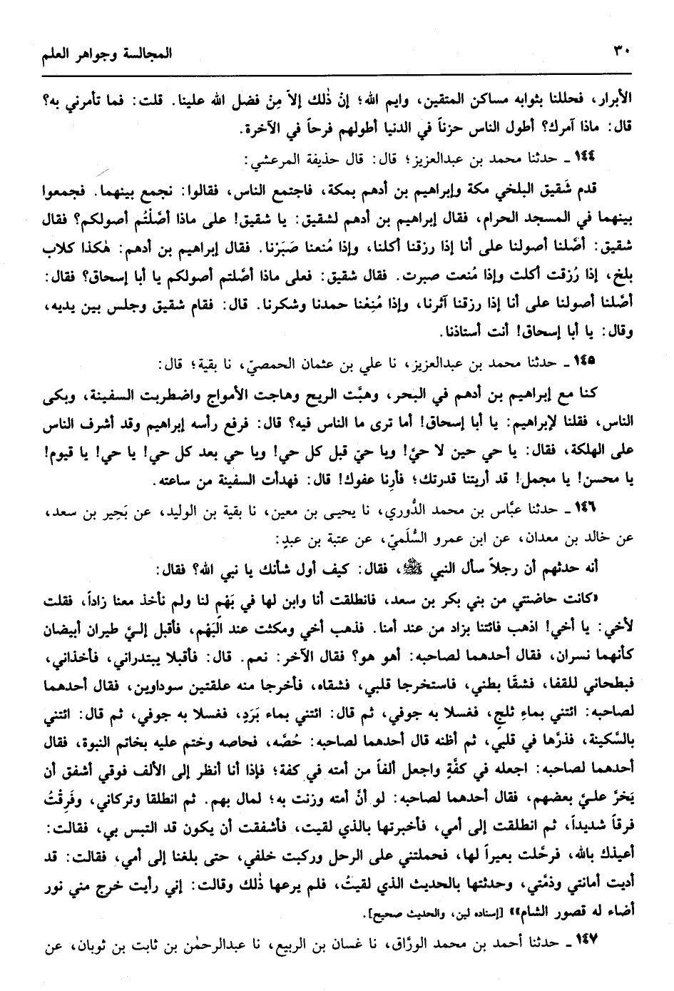 114 - حدثنا يحيى بن المختار نا بشر بن الحارث قال سمعت الفضيل بن عياض يقول ما أحد من أهل العلم إلاّ وفي وجهه نضرة لقول النبي {صلى الله عليه وسلم} نضَّر الله امرءاً سمع منَّا حديثاً