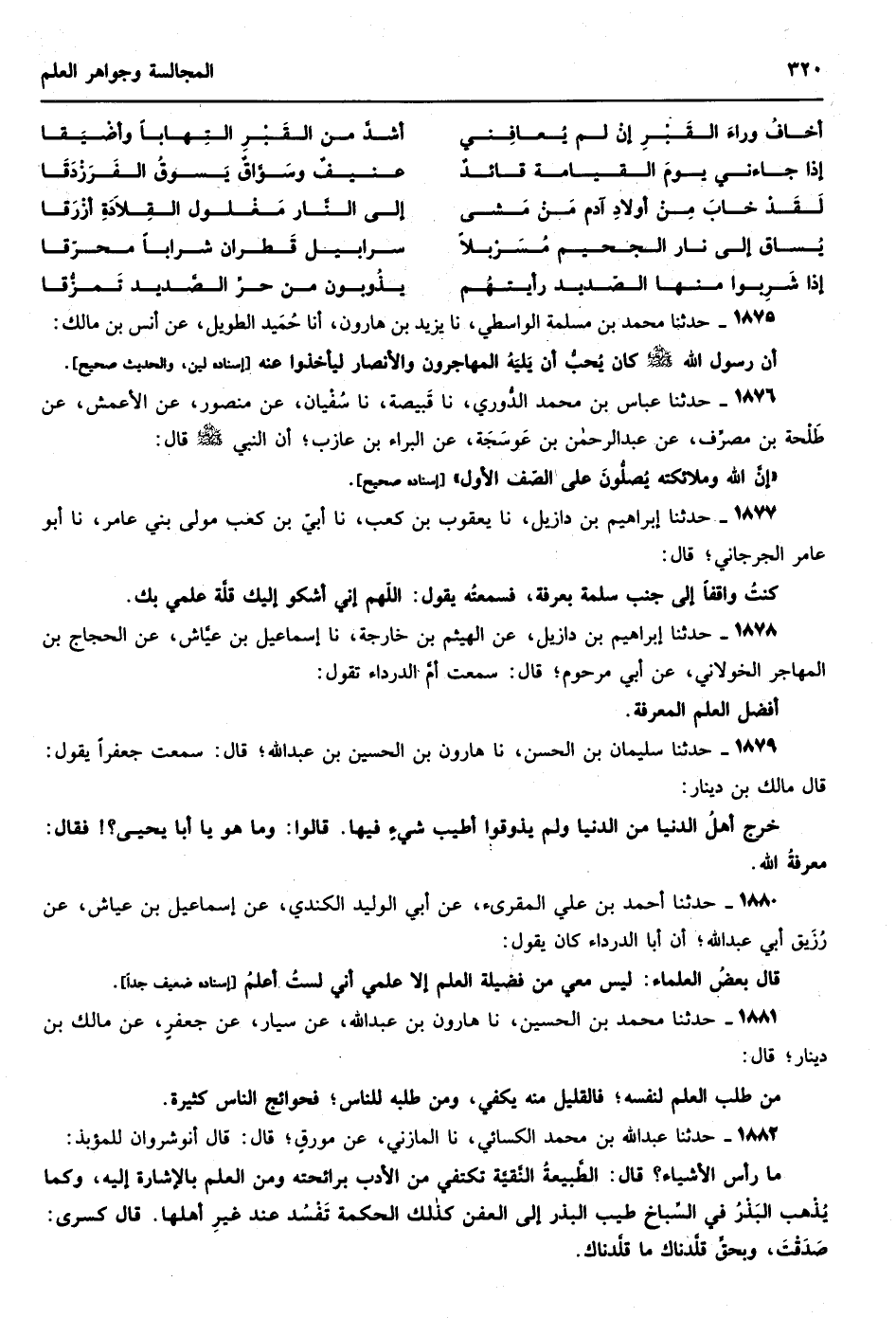 1466 - حدثنا أحمد نا أبو بكر بن أبي الدنيا نا علي بن الجعد أخبرني عمرو بن شمر عن السدي عن أبي أراكة قال صليت مع علي بن أبي طالب رضي الله عنه الفجر فلما سلم انفتل عن يمينه ثم مكث كأن عليه كآبة حتى إذا كانت الشمس على حائط المسجد قيد رمح - وكان حائط المسجد أقصر مما هو الآن - ثم قلب يده ثم قال والله لقد رأيت أصحاب محمد {صلى الله عليه وسلم} فما أرى اليوم شيئا يشبههم لقد كانوا يصبحون صفرا شعثا غبرا بين أعينهم كأمثال ركب المعز قد باتوا لله سجدا وقياما يتلون كتاب الله عز وجل ويراوحون بين جباههم وأقدامهم فإذا أصبحوا وذكروا الله عز وجل مادوا كما تميد الشجر في يوم الريح وهملت أعينهم حتى تبل ثيابهم والله لكأن القوم باتوا غافلين ثم نهض فما رئي مفترا ضاحكا حتى ضربه ابن ملجم عدو الله الفاسق إسناده هالك