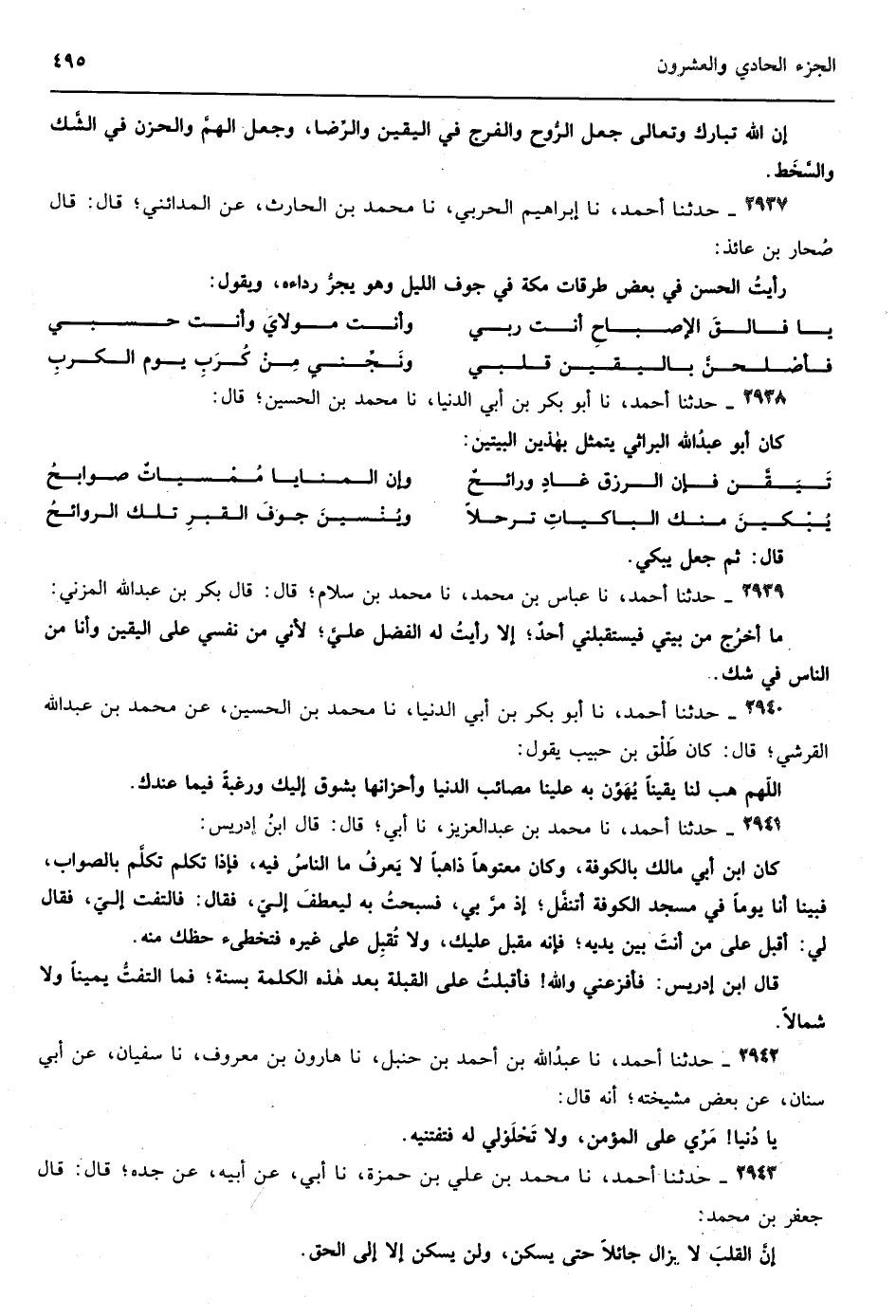 2292 - حدثنا سليمان بن الحسن نا أبي قال قال ابن المبارك قدمت مكة وإذا الناس قد قحطوا من المطر وهم يستسقون في المسجد الحرام وكنت في الناس مما يلي باب بني شيبة إذا أقبل غلام أسود عليه قطعتا خيش قد ائتزر بأحداهما وألقى الأخرى على عاتقه فصار في موضع خفي إلى جانبي فسمعته يقول إلهي أخلقت الوجوه كثرة الذنوب ومساوئ الأعمال وقد منعتنا غيث السماء لتؤدب الخليقة بذلك فأسألك ياحليم ذو أناة يا من لا يعرف عباده منه إلا الجميل اسقهم الساعة الساعة قال ابن المبارك فلم يزل يقول الساعة الساعة حتى استوت بالغمام وأقبل المطر من كل مكان وجلس مكانه يسبح فأخذت أبكي إذ قام فاتبعته حتى عرفت موضعه فجئت إلى فضيل بن عياض فقال لي ما لك أراك كئيبا قلت سبقنا إليه غيرنا فتولاه دوننا فقال وما ذاك فقصصت عليه القصة فصاح وسقط وقال ويحك يا ابن المبارك خذني إليه قلت قد ضاق الوقت وسأبحث عن شأنه فلما كان من غد صليت الغداة وخرجت أريد الموضع فإذا شيخ على الباب قد بسط له وهو جالس فلما رآني عرفني فقال مرحبا بك يا أبا عبد الرحمن حاجتك فقلت له احتجت إلى غلام أسود فقال نعم عندي عدة فاختر أيهم شئت وصاح يا غلام فخرج غلام جلد فقال هذا محمود العاقبة أرضاه لك فقلت ليس هذا حاجتي فما زال يخرج إلي واحدا واحدا حتى أخرج إلي الغلام فلما بصرت به بدرت عيناي فجلست فقال هذا هو فقلت نعم فقال ليس إلى بيعه سبيل قلت ولم قال تبركت بموضعه في هذه الدار وذلك