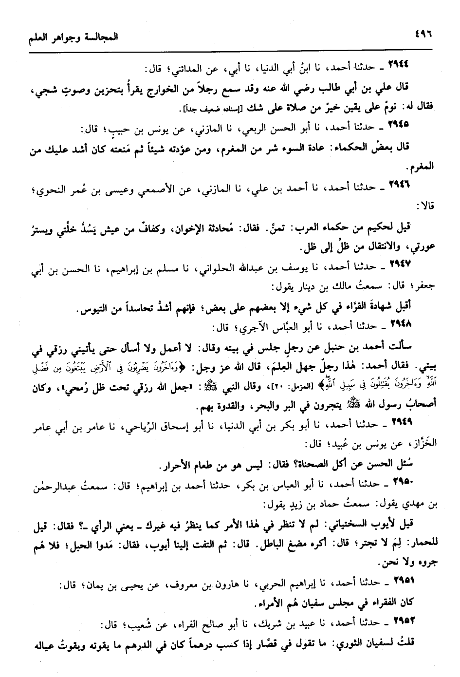 أنه لا يرزؤني منه شيء أكثر من قوته قلت ومن أين طعامه وشرابه قال يكسب من فتل الشريط نصف دانق أو أقل أو أكثر فهو قوته فإن باعه في يومه وإلا طوى ذلك اليوم وأخبرني الغلمان عنه أنه لا ينام هذا الليل الطويل ولا يختلط بأحد منهم مهتم بنفسه وقد أحبه قلبي فقلت له أنصرف إلى سفيان الثوري وإلى فضيل بن عياض بغير قضاء حاجة فقال إن ممشاك عندي كبير فخذه بما شئت قال فاشتريته فأخذت نحو دار فضيل بن عياض فمشيت ساعة إذ قال لي يا مولاي قلت لبيك فقال لا تقل لي لبيك فإن العبد أولى بأن يلبي المولى قلت حاجتك يا حبيبي قال أنا ضعيف البدن لا أطيق الخدمة وفي غيري كان لك سعة قد أخرج إليك من هو أجلد مني فقلت لا يراني الله وأنا أستخدمك ولكن أشتري لك منزلا وأزوجك وأخدمك أنا بنفسي قال فبكى فقلت له ما يبكيك قال انت لم تفعل بي هذا إلا وقد رأيت بعض متصلاتي بالله وإلا فلم اخترتني من بين أولئك الغلمان فقلت له ليس بك حاجة إلى هذا فقال لي سألتك بالله ألا أخبرتني فقلت بإجابة دعوتك فقال لي لما ذكرت له ذلك إني أحسبك إن شاء الله رجلا صالحا إن لله عز وجل خيرة من خلقه لا يكشف شأنهم إلا لمن أحب من عباده ولا يظهر عليهم إلا من ارتضى ثم قال لي ترى أن تقف علي قليلا فإنه قد بقيت علي ركعات من البارحة قلت هذا منزل فضيل قريبا قال لا ها هنا أحب إلي أمر الله عز وجل لا يؤخر فدخل من باب الباعة إلى المسجد فما زال يصلي حتى إذا أتى على ما أراد التفت إلي فقال يا أبا عبد الرحمن هل من حاجة قلت ولم قال لأني أريد الانصراف قلت إلى أين قال إلى الآخرة قلت لا تفعل دعني أسر بك فقال لي إنما كانت تطيب لي الحياة حيث كانت المعاملة بيني وبينه - يعني ربه تعالى - فأما إذا اطلعت عليها أنت فسيطلع عليها غيرك وغيرك فلا حاجة لي في ذلك ثم خر لوجهه فجعل يقول إلهي اقبضني الساعة الساعة فدنوت منه فإذا هو قد مات فوالله ما ذكرته قط إلا طال حزني عليه وصغرت الدنيا في