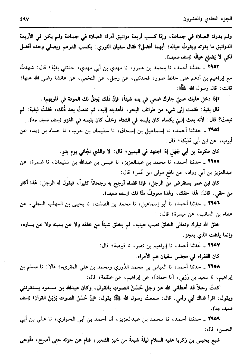 2295 - وحدثنا محمد بن موسى بن حماد نا محمد بن الحارث نا المدائني قال قال عبد الله بن عمرو بن العاص يؤتى برجل يوم القيامة ويخرج له تسعة وتسعون سجلاً فيها خطاياه وتخرج له بطاقة - يعني رقعة - فيها شهادة أن لا إله إلا الله فترجح بها إسناده ضعيف