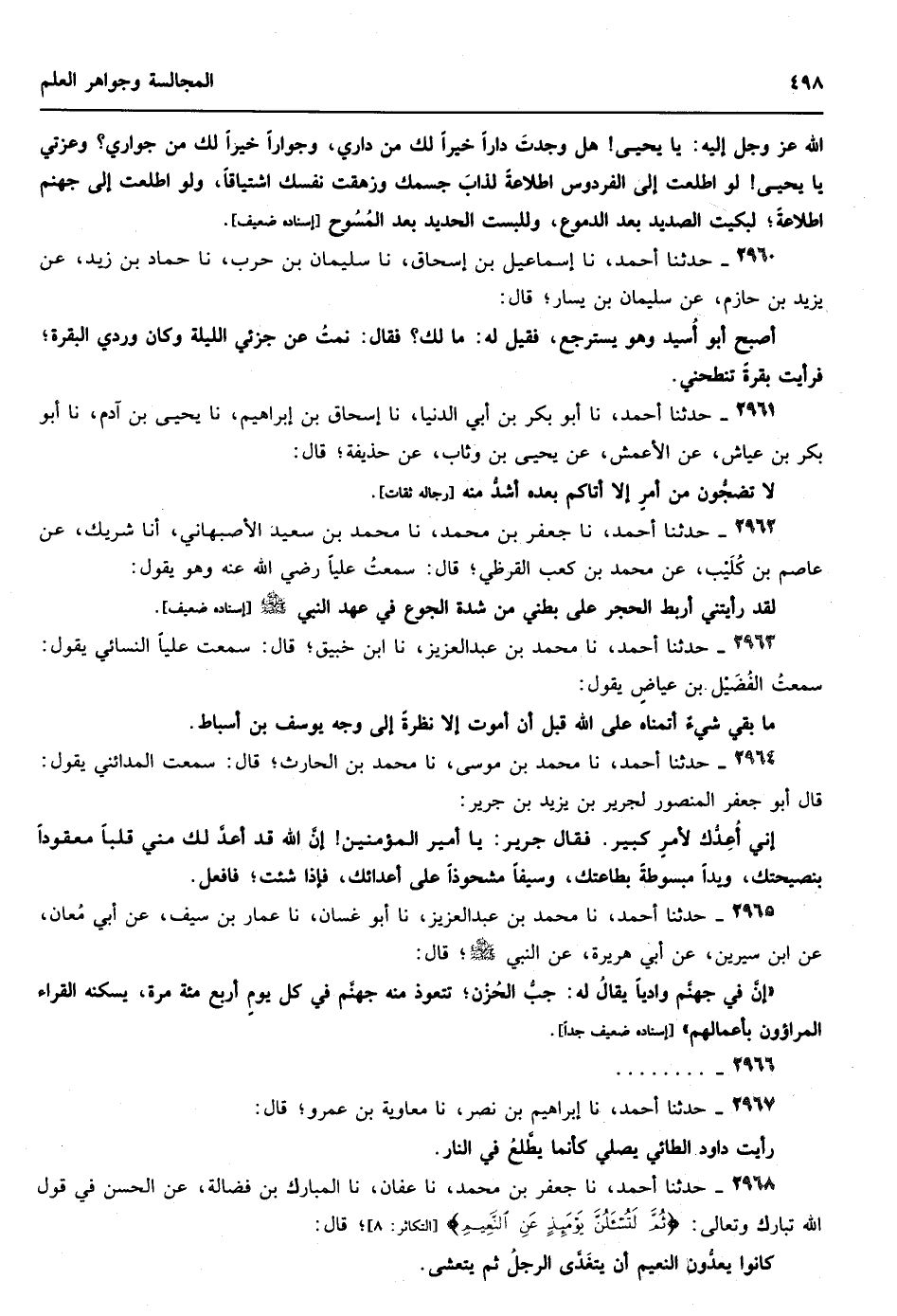 2298 - حدثنا أحمد بن علي نا عبد الصمد قال قال الفضيل بن عياض ليلة أجعتني وأجعت عيالي وأعريتني وأعريت عيالي ولي ثلاثة أيام ما أكلت ولا أكل عيالي ولي ثلاث ليال ما استصبحت فبما بلغت عندك حتى فعلت بي هذا وإنما تفعل هذا يا رب بأوليائك أفتراني أنا منهم اللهم إلهي إن فعلت بي هذا يوما آخر علمت أني منك على بال قال فلما كان يوم الرابع فإذا داق يدق الباب فقال من هذا فقال أنا رسول ابن المبارك وإذا معه صرة دنانير وكتاب يذكر فيه أنه لم يحج في هذه السنة وقد وجهت بكذا وكذا قال فجعل فضيل يبكي ويقول قد علمت أني أشقى من ذلك أن أكون عند الله بمنزلة أوليائه