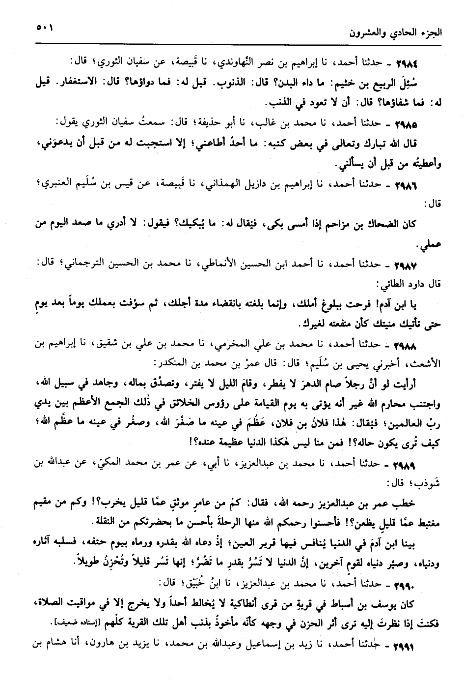 2317 - حدثنا إبراهيم بن نصر نا قبيصة عن سفيان الثوري قال قيل للربيع بن خثيم ما داء البدن قال الذنوب قيل له فما دواؤها قال الاستغفار قيل له فما شفاؤها قال أن لا تعود في الذنب