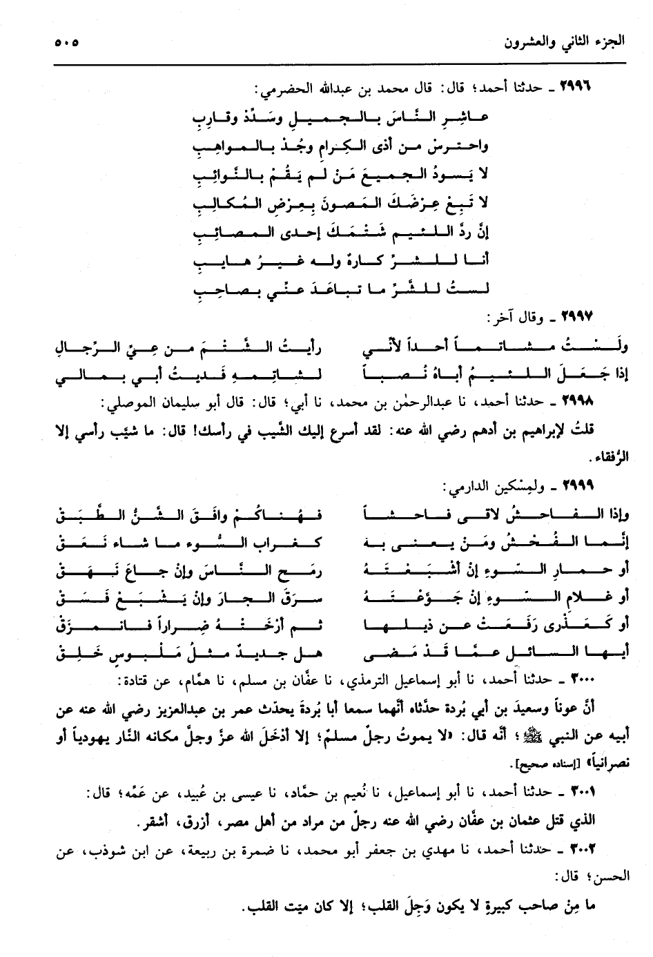 2338 - حدثنا عبد الله بن مسلم بن قتيبة نا الرياشي قال دخل رجل من أهل الشام على عبد الملك بن مروان فقال إني قد تزوجت امرأة وزوجت ابني أمها ولا غنى بنا عن رفدك فقال له عبد الملك إن أخبرتني ما قرابة ما بين أولادهما إذا ولد لكما فعلت بك كذا وكذا فقال يا أمير المؤمنين هذا حميد بن بحدل قد قلدته سيفك ووليته ما رواء بابك فسله فإن أصاب لزمني الحرمان واتسع لي العذر فدعا بالبحدلي فسأله فقال يا أمير المؤمنين إنك لم تقدمني على العلم بالأنساب ولكن قدمتني على الطعن بالرماح والضرب بالسيوف أحدهما عم الآخر والآخر خاله