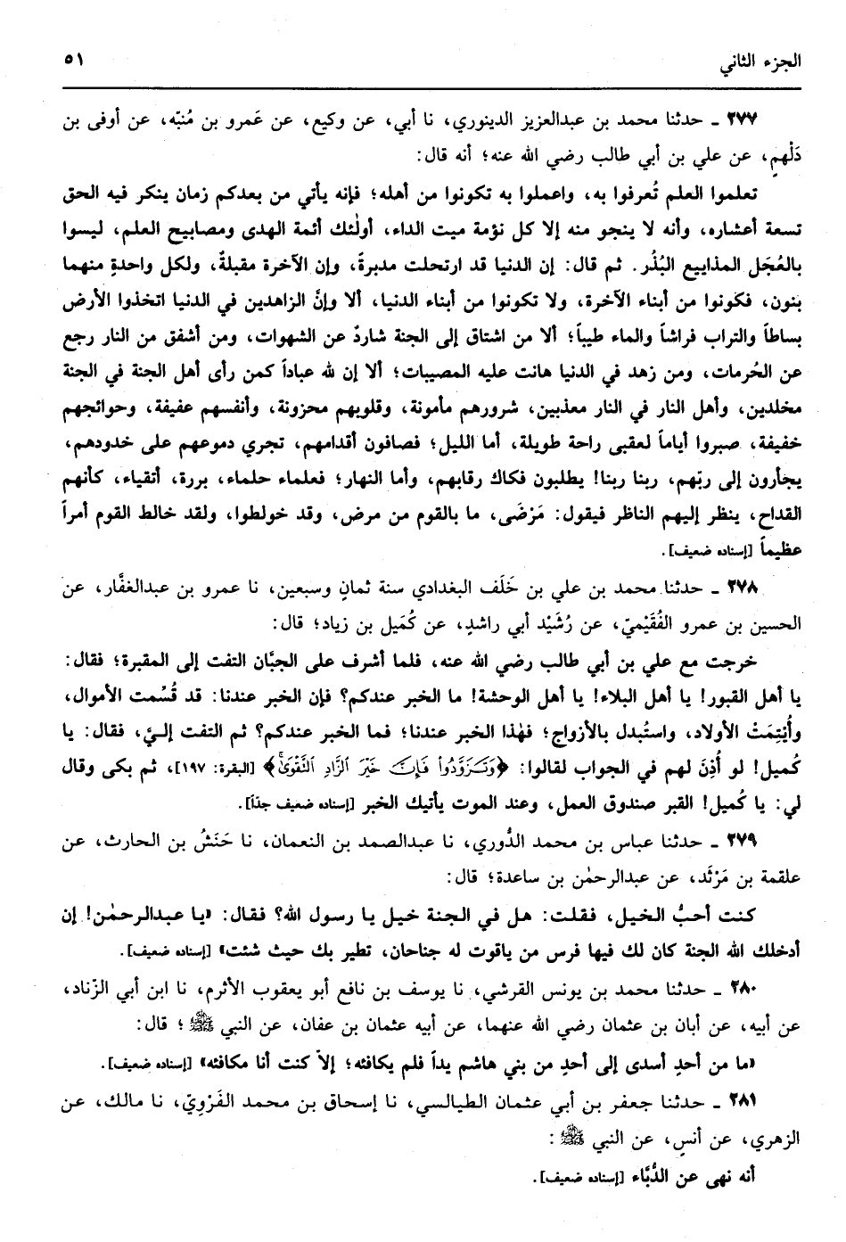 208 - حدثنا أحمد بن محمد البرتي نا موسى بن مسعود نا سفيان الثوري عن قدامة الضبي عن خالد بن منجاب قال قال زياد بن حدَيْر الأسدي لما اراد العلاء بن الحضرمي أن يعبر إلى أهل دَارين البحر عبر بهذه الكلمات يا حليم يا حكيم يا علي يا عليم ( قالها ثلاثاً ) فعبر هو وأصحابه البحر إسناده ضعيف