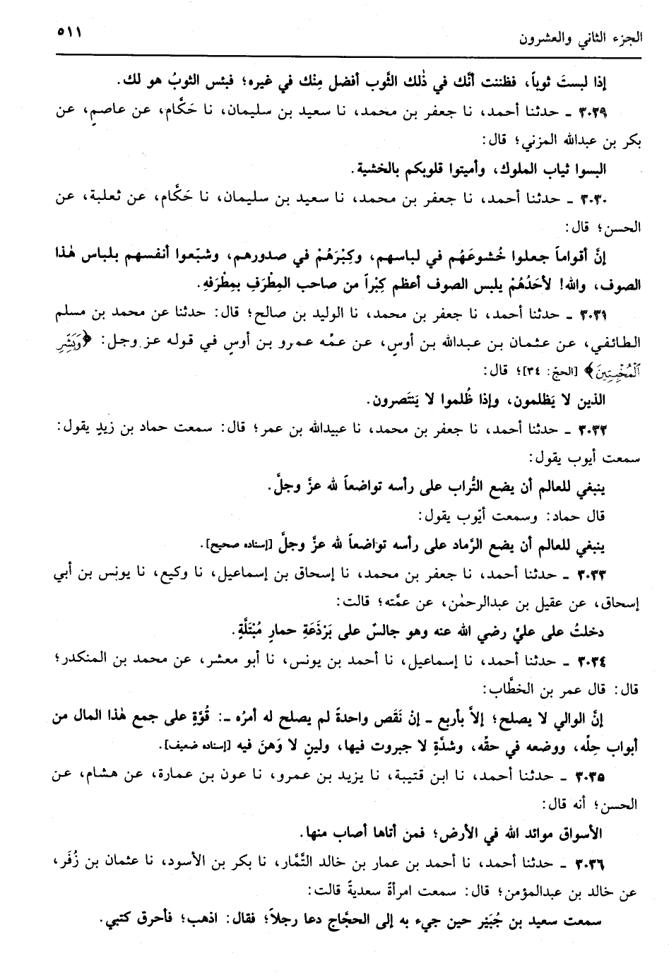 2366 - حدثنا زيد بن إسماعيل نا أبو صالح الفراء عن أبي إسحاق الفزاري قال كان إبراهيم بن أدهم يطيل السكوت فإذا تكلم انبسط فقلت له ذات يوم لو تكلمت فقال الكلام على أربعة وجوه فمنه كلام ترجو منفعته وتخشى عاقبته فالفضل فيه السلامة ومنه كلام لا ترجو منفعته ولا تخشى عاقبته فأقل ما لك في تركه خفة المؤنة على بدنك ولسانك ومنه كلام لا ترجو منفعته وتخشى عاقبته وهذا هو الداء العضال ومن الكلام كلام ترجو منفعته وتأمن عاقبته فهذا الذي يجب عليك نشره فإذا هو قد أسقط ثلاثة أرباع الكلام