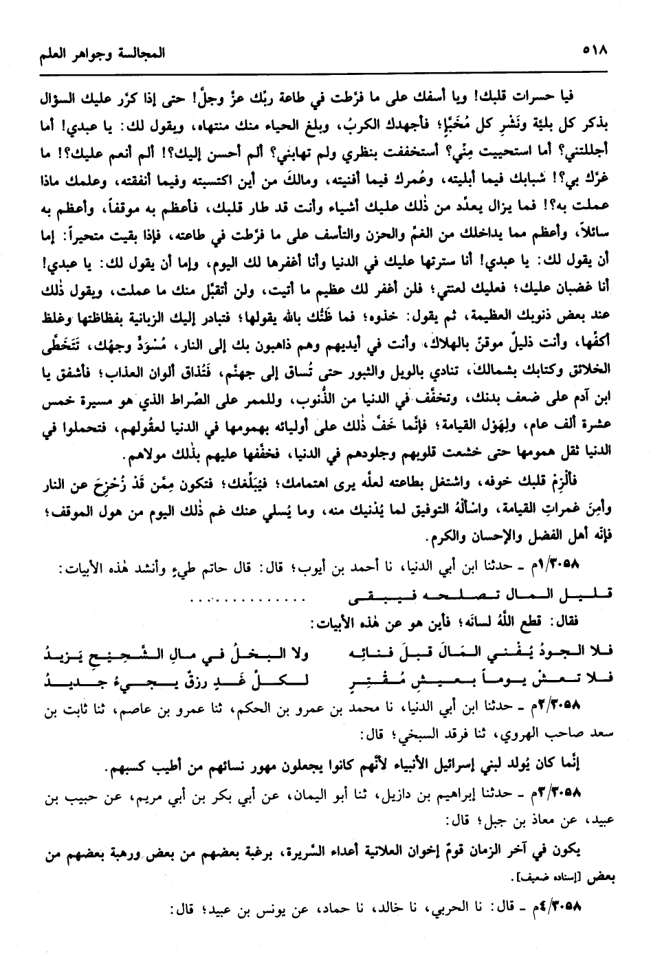 2403 - حدثنا محمد بن عبد العزيز نا الحسن بن السكن بن سليمان عن أبيه قال كتب بعض الزهاد إلى أخ له كثر تعجبي من قلب يألف الذنب ونفس تطمئن إلى البقاء والساعة تنقلنا والأيام تطوي أعمارنا فكيف يألف قلب ما لا ثبات له وكيف تنام عين لا تدري لعلها لا تطرف بعد رقدتها إلا بين يدي الله تبارك وتعالى والسلام