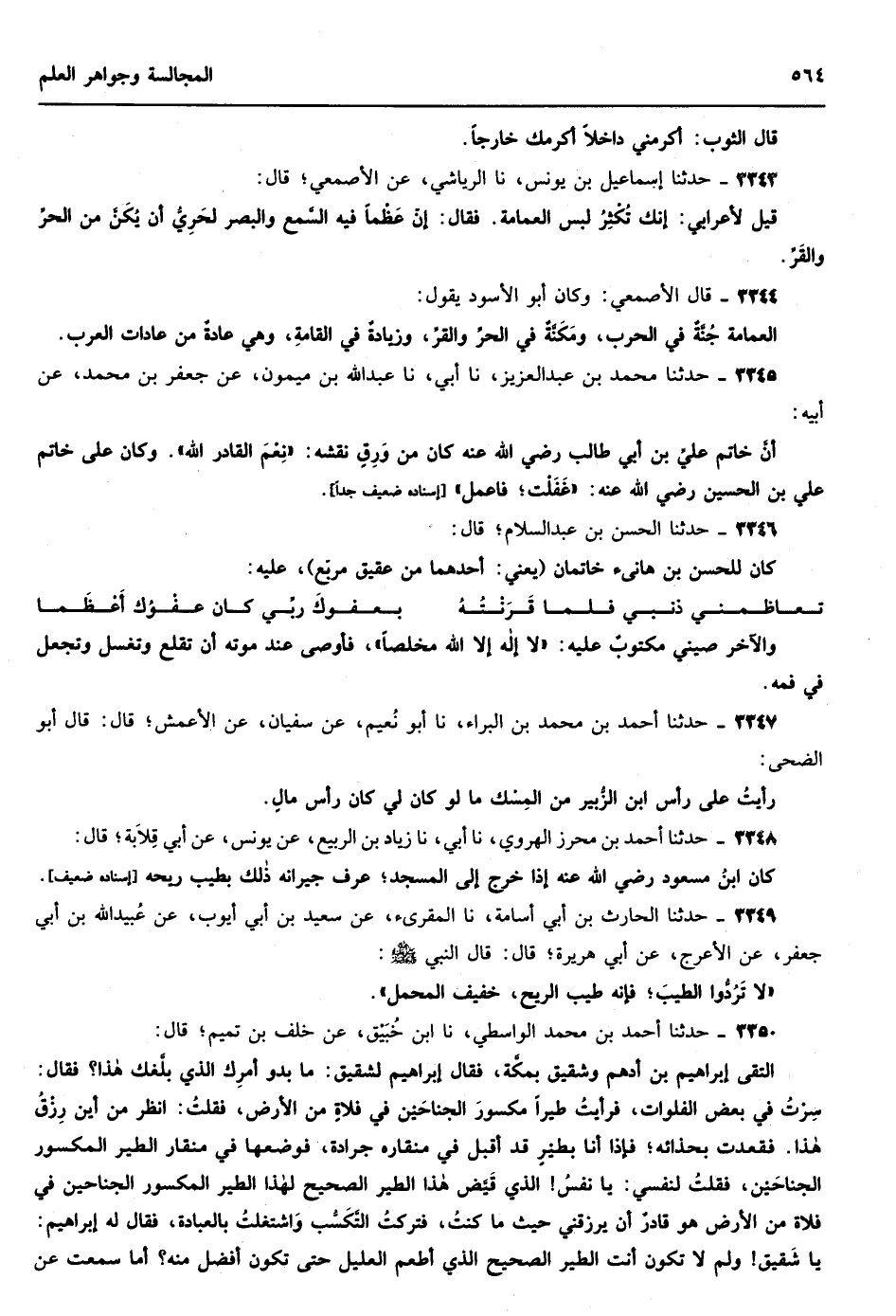 من كتاب المجالسة وجواهر العلم صلى الله على سيدنا محمد وعلى آله وصحبه وسلم أخبرنا أبو القاسم هبة الله بن علي بن سعود الأنصاري وأبو عبد الله محمد بن حمد بن حامد المصري إذنا قالا أنا أبو الحسن علي بن الحسين بن عمر الفراء الموصلي قال الأنصاري قراءة عليه وأنا أسمع وقال الآخر إجازة قال أنا أبو القاسم عبد العزيز بن الحسن بن إسماعيل بن الضراب أنا أبي نا أبو بكر أحمد بن مروان بن محمد الدينوري المالكي