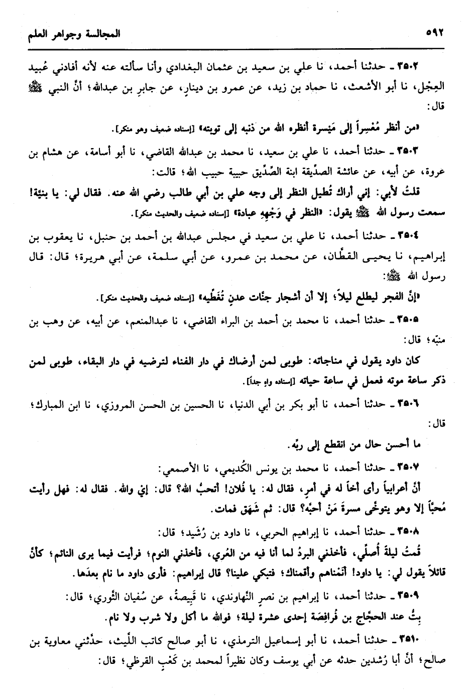 من كتاب المجالسة وجواهر العلم صلى الله على سيدنا محمد وعلى آله وصحبه وسلم تسليماً أخبرنا الشيخان أبو القاسم هبة الله بن علي بن سعود البوصيري وأبو عبد الله محمد بن حمد بن حامد الأرتاحي إذنا قالا أنا أبو الحسن علي بن الحسين بن عمر الفراء الموصلي قال البوصيري سماعا عليه وقال الأرتاحي إجازة أنا أبو القاسم عبد العزيز بن الحسن بن إسماعيل بن محمد بن مروان بن الغمر الغساني المعروف بابن الضراب قراءة عليه وأنا أسمع أنا أبي حدثنا أحمد بن مروان المالكي
