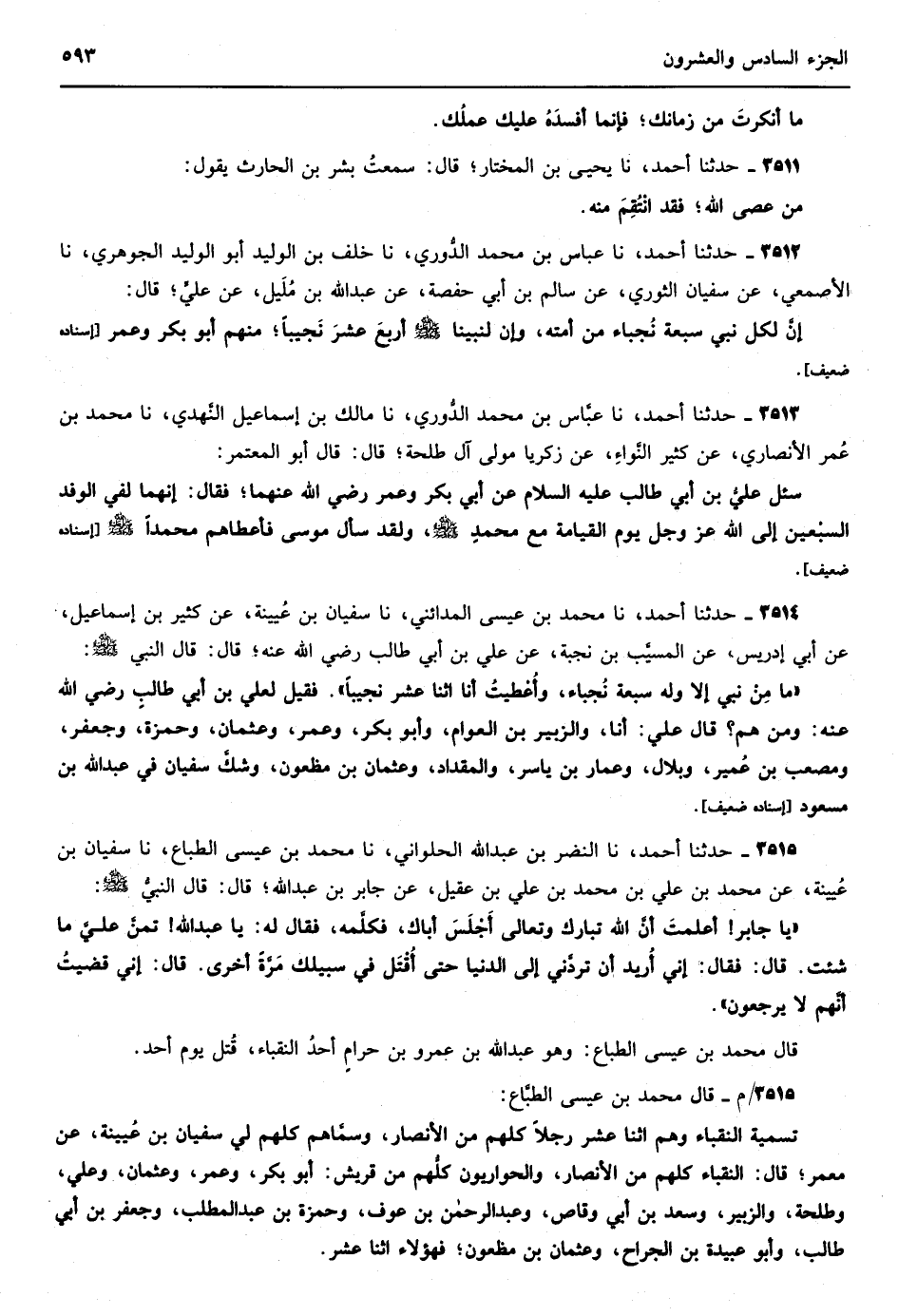 2782 - حدثنا إبراهيم بن إسحاق الحربي نا الحسن بن عبد العزيز نا أبو حفص عن صدقة عن بكار بن سحيم عن زيد بن أسلم قال جلس إلي رجل قد ذهبت يمينه من عضده فجعل يبكي ويقول من رآني فلا يظلمن أحدا فقلت وما حالك قال بينا أنا أسير على شط البحر إذ مررت بنبطي قد اصطاد سبعة أنوان فقلت أعطني نونا فأخذت نونا وهو كاره فانقلبت إلى النون وهو حي بعد فعض إبهامي عضة يسيرة لم أجد لها ألما فانطلقت إلى أهلي فصنعوه فأكلناه فوقعت الأكلة في إبهامي فاتفق لي الأطباء على أن أقطعها فقطعتها ثم عالجتها حتى إذا قلت قد برأت وقعت في كفي ثم في ساعدي ثم في عضدي فمن رآني فلا يظلمن أحداً
