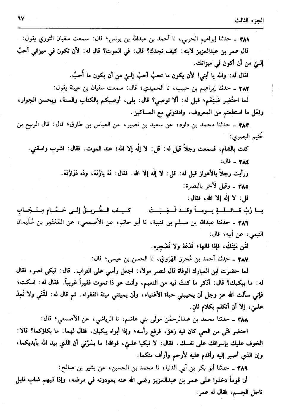 278 - حدثنا محمد بن علي بن خَلَف البغدادي سنة ثمانٍ وسبعين نا عمرو بن عبد الغفَّار عن الحسين بن عمرو الفُقَيْميّ عن رُشَيْد أبي راشدٍ عن كُمَيل بن زياد قال خرجت مع علي بن أبي طالب رضي الله عنه فلما أشرف على الجبَّان التفت إلى المقبرة فقال يا أهل القبور يا أهل البلاء يا أهل الوحشة ما الخبر عندكم فإن الخبر عندنا قد قُسِّمت الأموال وأُيْتِمَتْ الأولاد واستُبدل بالأزواج فهذا الخبر عندنا فما الخبر عندكم ثم التفت إليّ فقال يا كُميل لو أُذِنَ لهم في الجواب لقالوا ( وتَزَوَّدُوا فإِنَّ خَيْرَ الزَّادِ التَّقْوى ) البقرة 197 ثم بكى وقال لي يا كُميل القبر صندوق العمل وعند الموت يأتيك الخبر إسناده ضعيف جداً