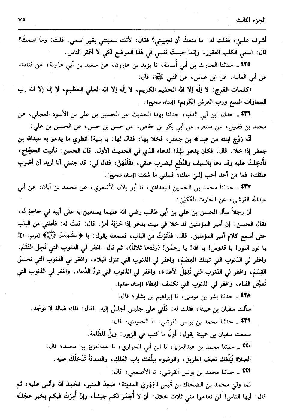 323 - حدثنا يوسف بن عبد الله نا محمد بن بِشْر نا ابن المبارك قال سمعت محمد بن النَّضْر الحارثي يقول ثلاث كلمات نفعني الله بِهِنَّ سمعته يقول إذا ذُكر الصالحون كُنتُ منهم بِمَعْزِل وسمعتُه يقول
