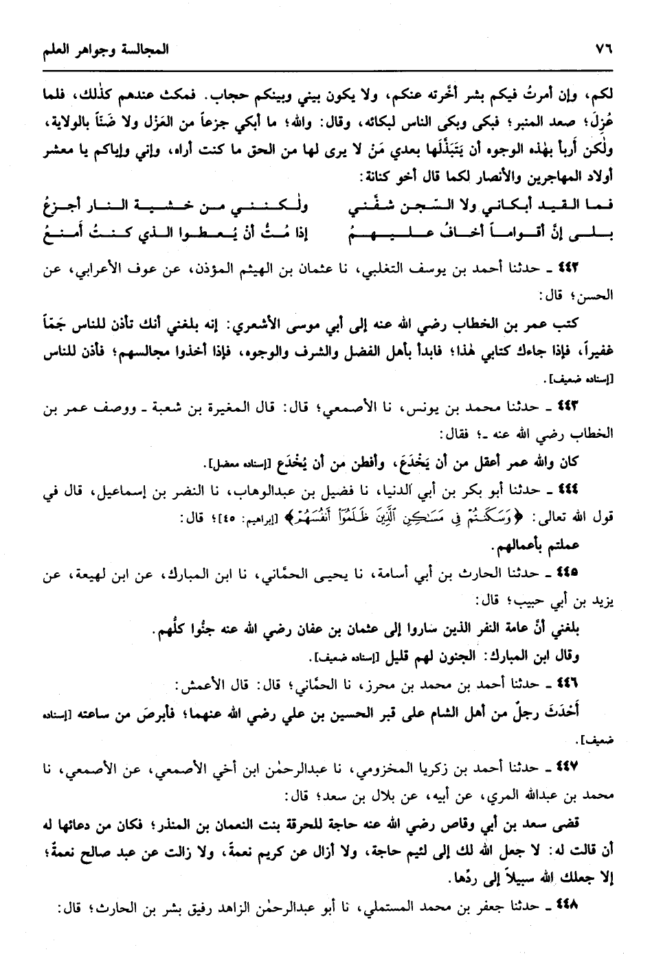 من كتاب المجالسة وجواهر العلم {صلى الله عليه وسلم} وعلى آله وصحبه وسلم أخبرنا الشيخ أبو عبد الله محمد بن حمد بن حامد الأرتاحي إذناً قال أنبأني الشيخ أبو الحسن علي بن الحسين بن عمر الفراء الموصلي كتابة ً قال أنا الشيخ أبو القاسم عبد العزيز بن الحسن بن إسماعيل بن الضراب الغساني أنا أبي أبو محمد الحسن بن إسماعيل بن محمد بن مروان بن الغمر الغساني الضراب قراءة ً عليه في منزله حدثنا أبو بكر أحمد بن مروان بن محمد بن مالك الدينوري المالكي القاضي قراءة ً عليه وأنا أسمع