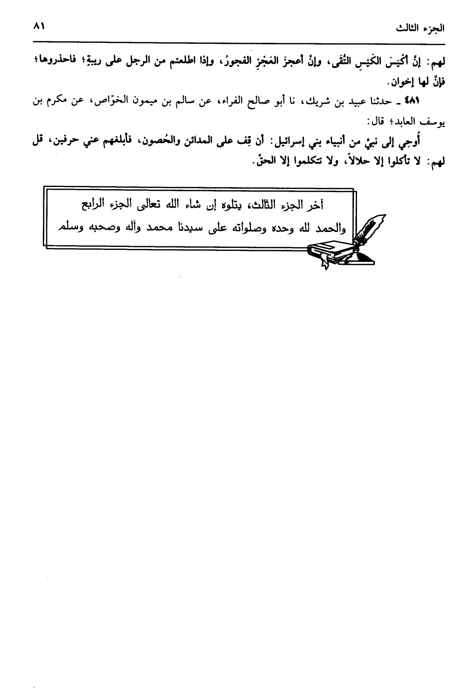 360 - حدثنا هارون بن الحسن نا خلف بن تميم قال دخل إبراهيم بن أدهم الجبل ومعه فأس رُوميّ فاحتطب حطباً كثيراً ثم جاء به فباعه واشترى به ناطفاً ثم جاء به إلى أصحابه فقال لأصحابه كلوا كأنكم تأكلون في رَهْنٍ