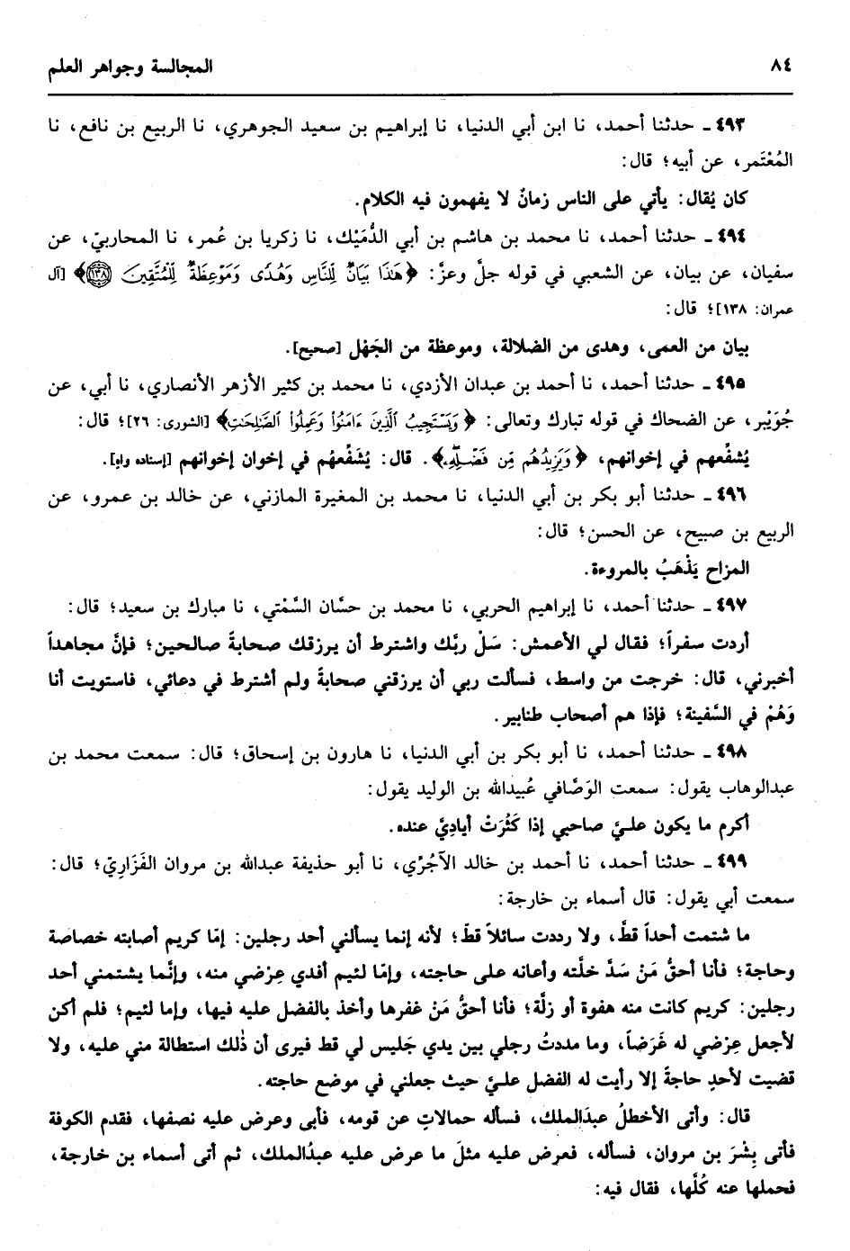375 - حدثنا الحارث بن أبي أُسامة نا داود بن المحبّر نا عبد الواحد بن الخطاب قال أقبلنا قافلين من بلد الروم نُريد البصرة حتى إذا كنا بين الرّصافة وحمص سمعنا صائحاً يصيح من بين تلك الرمال - تسمعه الآذان ولم تره الأعين - يقول يا مستور يا محفوظ اعقِل في سِتْر مَنْ أنت واتَّقِ الدنيا فإنها غرّارة فإنْ كنتَ لا تعقِل كيف تتقيها فصيّرها شوكاً ثم انظر أين تضع قدميك منها