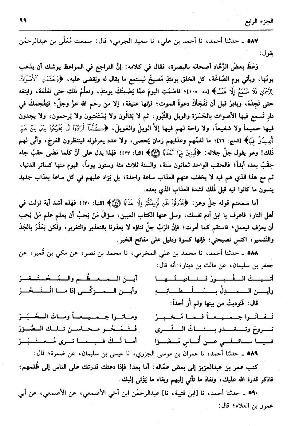 450 - حدثنا عبد الله بن مسلم قال سمعت الرياشي يقول سمعت الأصمعي يقول كان بلال بن سعد يصلي الليل أجمع فكان إذا غلبه النوم في الشتاء وكان في داره بركة ماء فيجيء فيطرح نفسه مع ثيابه في الماء حتى ينفر عنه النوم فعوتب في ذلك فقال ماء البركة في الدنيا خير من صديد أهل جهنم